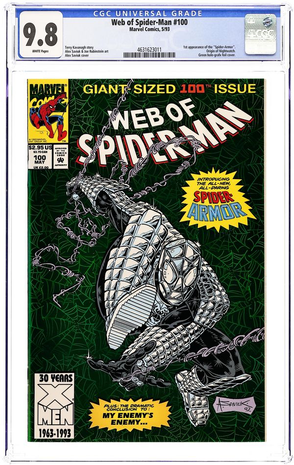 Direct Edition. "Uneasy Alliances" Part 4 of 4. Giant-Sized Anniversary Issue. Script by Terry Kavanagh. Pencils by Alex Saviuk. Inks by Joe Rubinstein. Green foil cover by Alex Saviuk. It's the 100th issue of the Web of Spider-Man series! And all roads (to take over the Kingpin's crime syndicate) lead to a mysterious estate on the outskirts of Manhattan! The Blood Rose is there! And so are the New Enforcers: Blitz, Eel, Tangle, Plantman, and Thermite! Along with the Dragon Man, Dreadnaught, and Super-Adaptoid! But before Peter Parker arrives, he decides to add something new to his usual red-and-blue ensemble…the Spider-Armor! Great idea! Because the web-slinger is going to need it when he battles no less than five super-villains and two Richard Fisks! With a little help from Nightwatch, the Amazing Spider-Man may turn the Spider-Armor's debut into a smashing success! It's every man for himself in the wild conclusion to the My Enemy's Enemy storyline! First appearance of the Spider-Armor. Cameo appearances by the Controller, Fixer, Mentallo, and Mr. Fear. Second story: "The Origin of Nightwatch" Script by Terry Kavanagh. Pencils and Inks by Derek Yaniger. The tragic story of how Dr. Kevin Trench became Nightwatch is revealed. (Notes: The issue provides new details about the Name of the Rose storyline that took place in Web of Spider-Man 84-89. Nightwatch appears next in Web of Spider-Man Annual 9. Richard Fisk returns years later in Daredevil (2nd series) 27-31.) 48 pages Cover price $2.95.