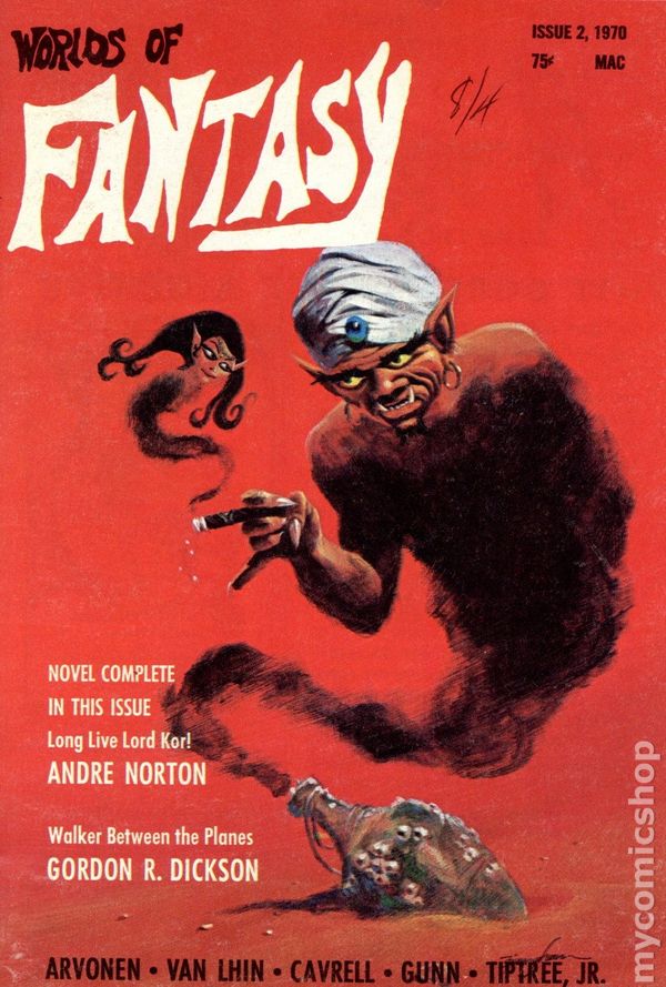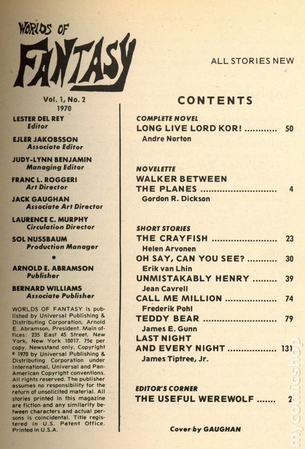 Issue 2, 1970. Cover and illustrations by Jack Gaughan. Fantasy Stories: "Long Live Lord Kor!" by Andre Norton, "Walker Between the Planes" by Gordon R. Dickson, "The Crayfish" by Helen Arvonen, "Oh Say, Can You See?" by Erik Van Lhin, "Unmistakably Henry" by Jean Cavrell, "Call Me Million" by Frederik Pohl, "Teddy Bear" by James E. Gunn, and "Last Night and Every Night" by James Tiptree, Jr. Softcover Pulp Digest, 5 1/4-in. x 7 5/8-in.; black and white; 192 pages. Cover price $0.75.