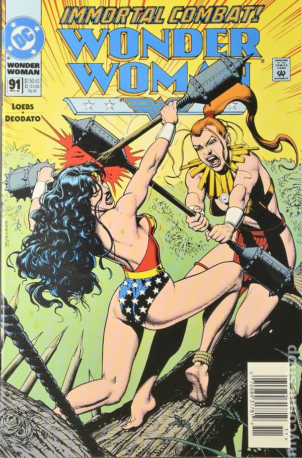 Newsstand Edition. Part 3 of the 5-part 'The Contest,' continued from Wonder Woman (1987-2006 2nd Series) #0. The contest for the role of Wonder Woman is at hand. Among those vying for the right: an Amazon warrior from the newly returned lost tribe. Meanwhile, a mob war is brewing in Boston, heralding the return of a deadly foe and proving that the world needs Diana and Wonder Woman. Continues next issue. Written by William Messner-Loebs, with art by Mike Deodato. Cover by Brian Bolland. 36 pgs. Cover price $1.50.