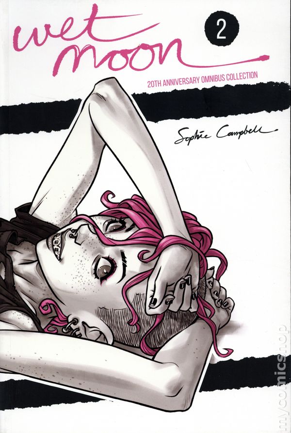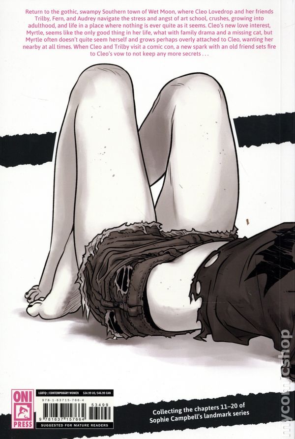 Volume 2 - 1st printing. Story and art by Sophie Campbell. Continuing the 20th anniversary celebration of Sophie Campbells landmark series Wet Moon, the second of three softcover omnibus volumes! Return to the gothic, swampy Southern town of Wet Moon, where Cleo Lovedrop and her friends Trilby, Fern, and Audrey navigate the stress and angst of art school, crushes, and growing into adulthood. Softcover, 456 pages, B&W. Cover price $34.99.