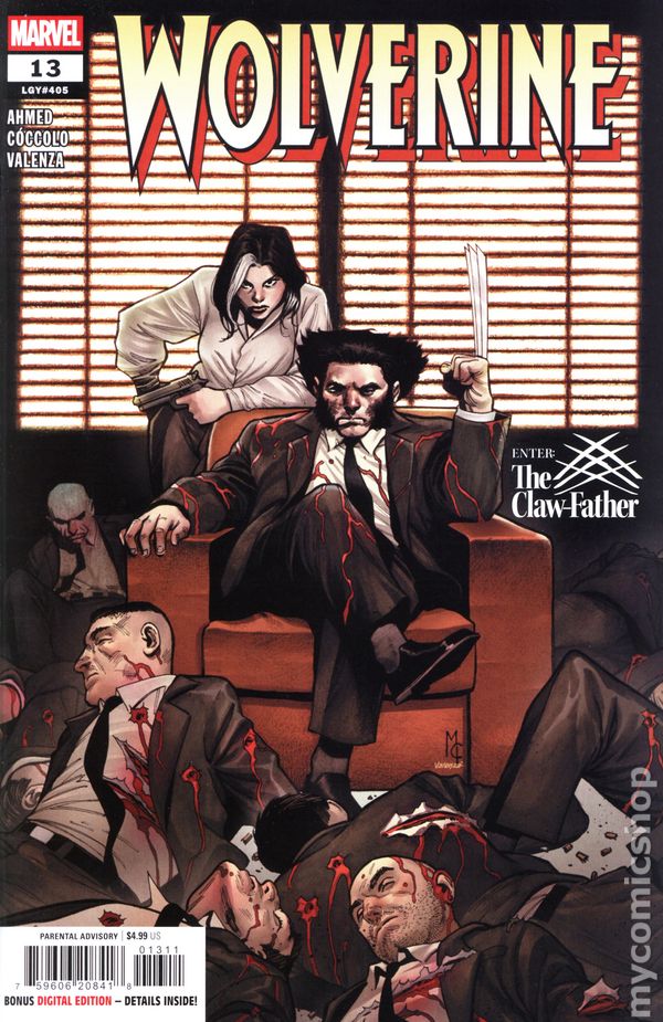 Written by Saladin Ahmed. Art by Martin Coccolo. Cover by Martin Coccolo. DON LOGAN GETS AN OFFER HE CAN'T REFUSE! WOLVERINE - the head of an organized crime family?! Not a hoax, not an imaginary tale - LOGAN takes the mantle, but who's after his head? 32 pages, full color. Rated Parental Advisory Cover price $4.99.