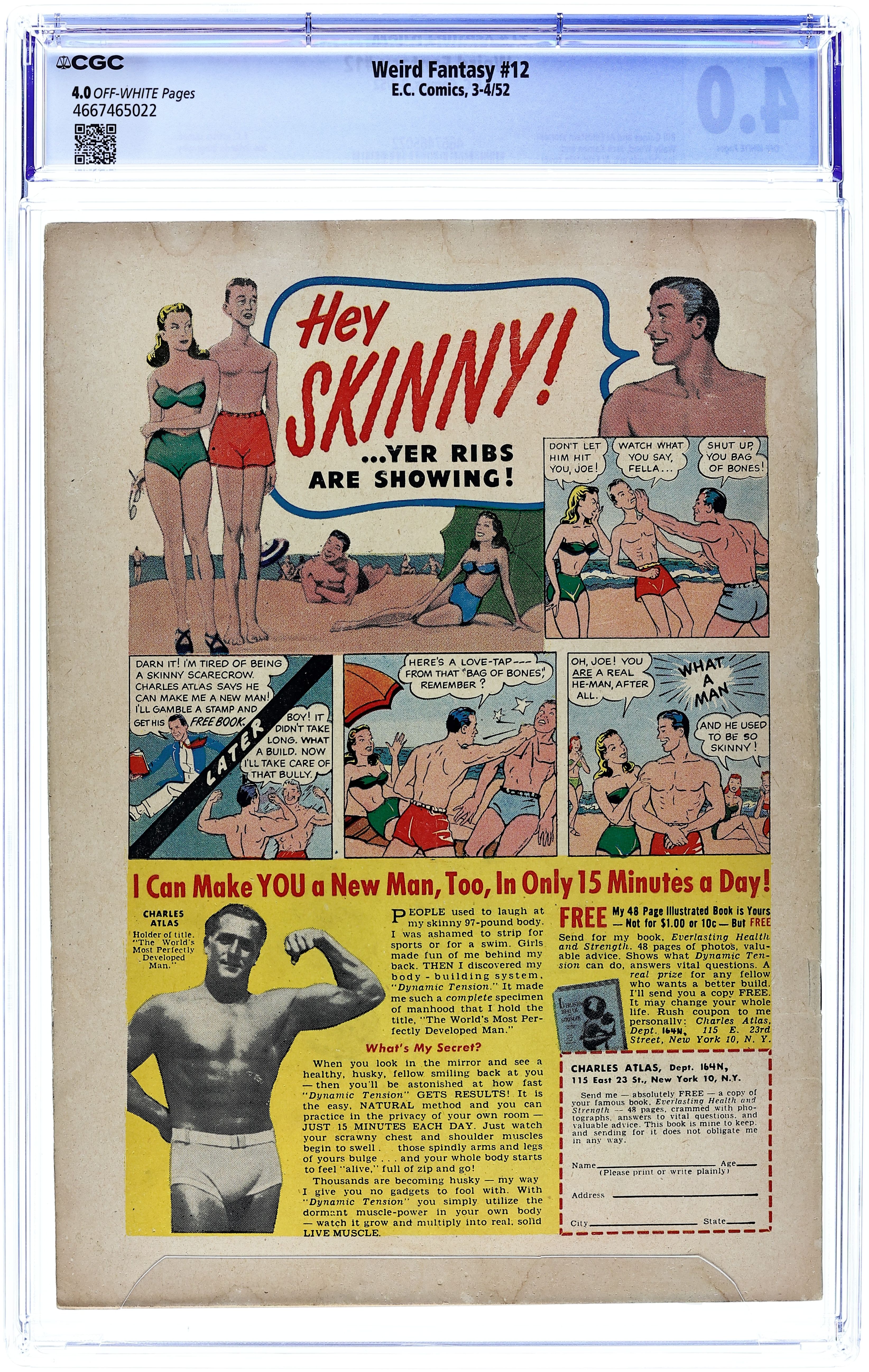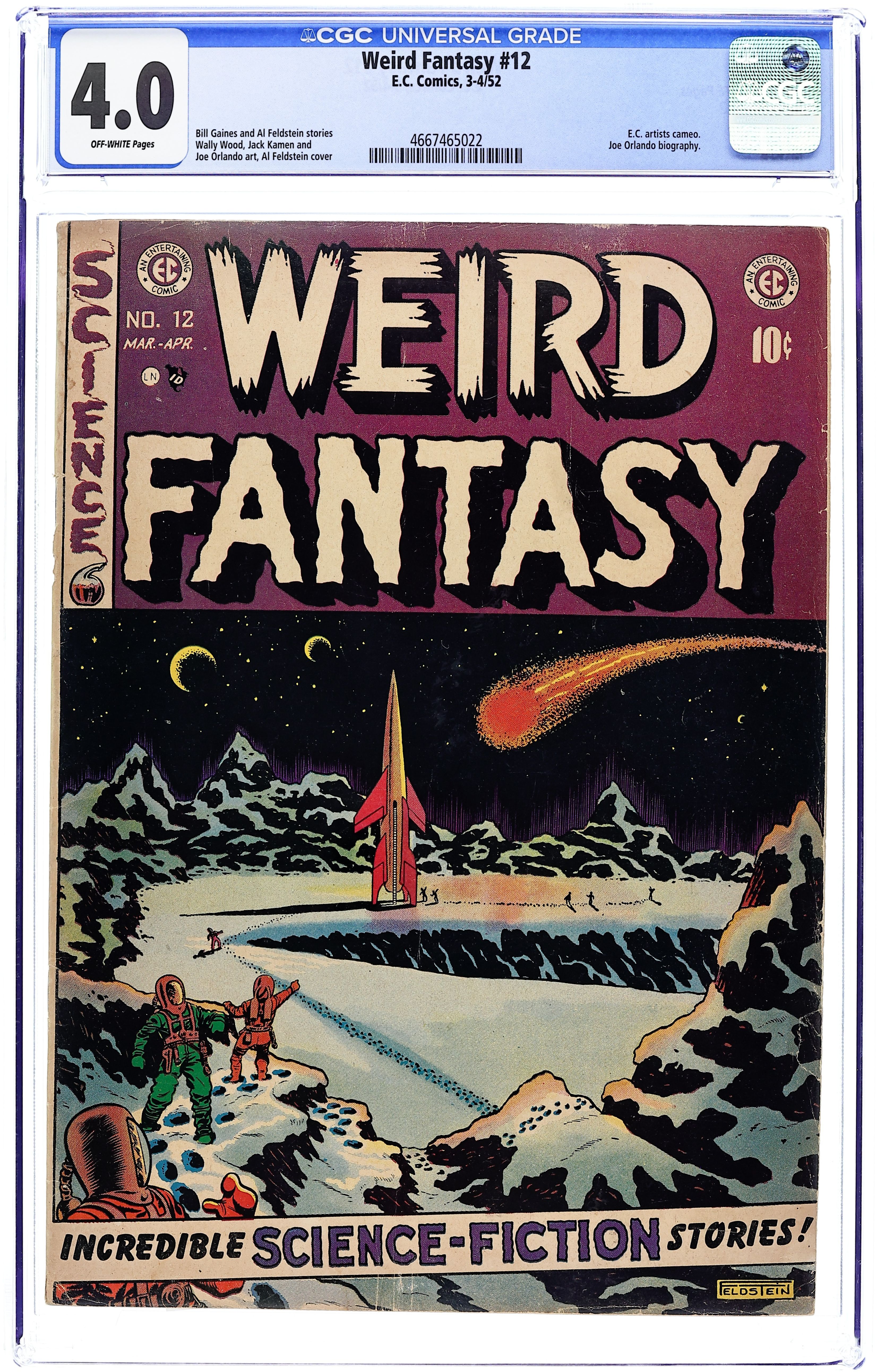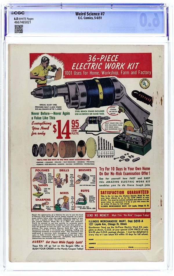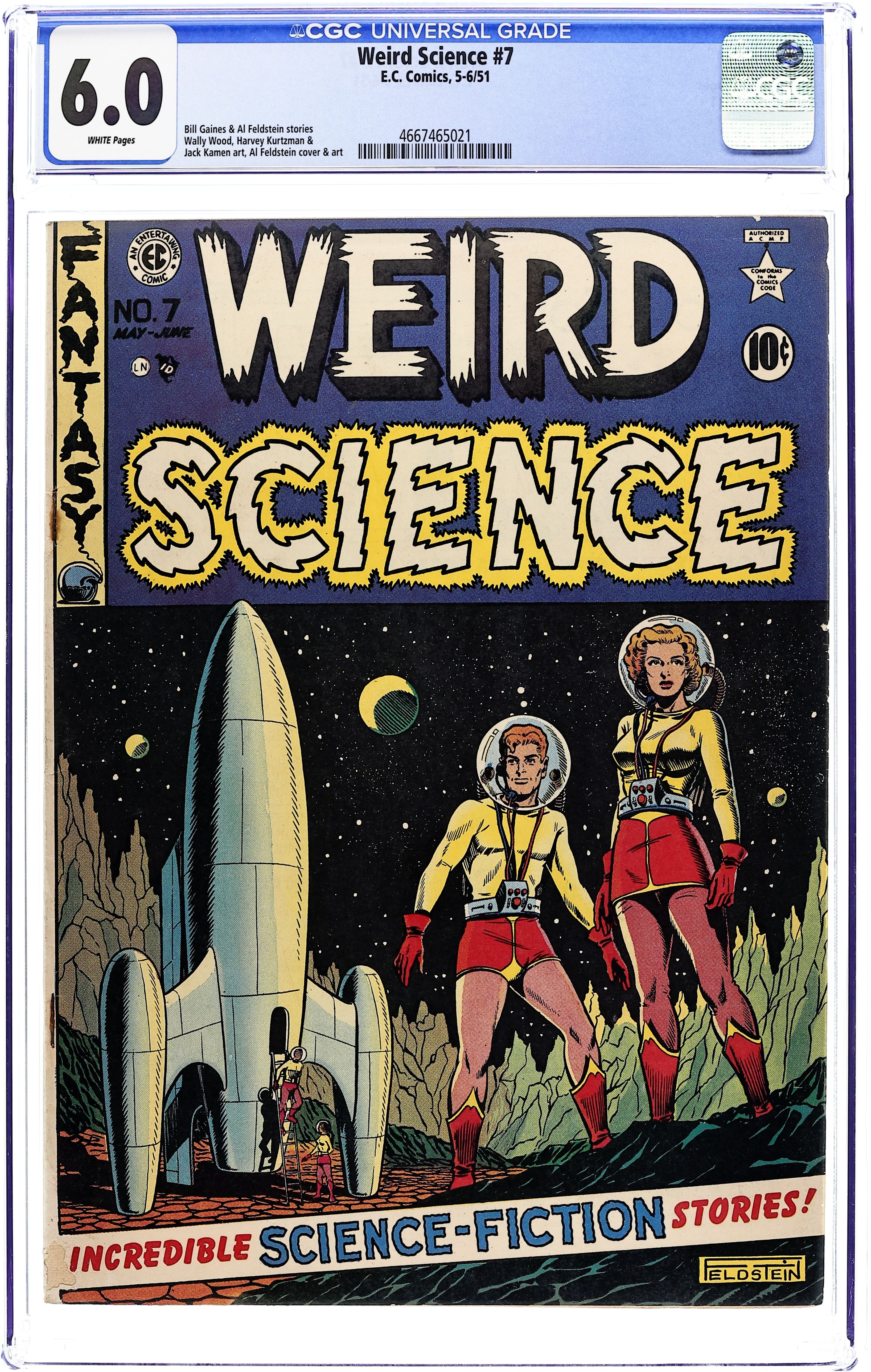 Cover by Al Feldstein. Stories by Harvey Kurtzman, Bill Gaines and Al Feldstein. Art by Harvey Kurtzman, Jack Kamen, Wally Wood, and Al Feldstein. EC's influential New Trend title featured some legendary sci-fi and comics artists. A man has an unhealthy reciprocal relationship with his Model T auto, in a story by Harvey Kurtzman. A communications glitch results in war between two planets, with tragic consequences for Earth, illustrated by Wally Wood. A scientist and his hillbilly brother capture a bloblike visitor from the fourth dimension. Classic Al Feldstein rocket/space cover. It Was the Monster From the Fourth Dimension; Something Missing!; Miracle!; …Gregory Had a Model-T!; The Aliens! 36 pages, Full Color. Cover price $0.10.