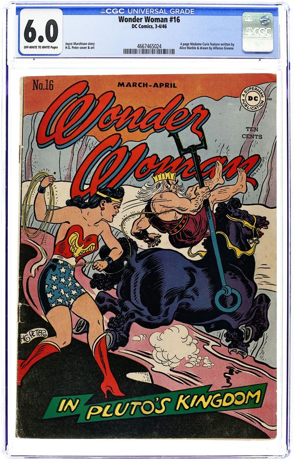 Cover by Harry G. Peter. "In Pluto's Kingdom Part 1: The Secret of the Dark Planet," script by Joye Hummel (as Charles Moulton), art by Harry G. Peter; After a Holliday girl is abducted by King Pluto, Wonder Woman and the Holliday girls travel to the furthest planet, where the king extracts their "color bodies" to light his gloomy planet and attempts to melt Wonder Woman like a color tablet. "In Pluto's Kingdom Part 2: The River of Liquid Fire," script by Joye Hummel (as Charles Moulton), art by Harry G. Peter; Wonder Woman and her girls pierce Pluto's underworld and fight off his forces to retrieve their "dark earth" bodies, while Pluto escapes to mount an assault on Earth. Wonder Women of History: four-page Madame Curie bio, script by Alice Marble, art by Alfonso Greene. Two-page text story, "Dangerous Adventure" by Jim Robinson. "In Pluto's Kingdom Part 3: King Pluto's Revenge," script by Joye Hummel (as Charles Moulton), art by Harry G. Peter; Pluto kidnaps Steve and extorts a dynamo from Wonder Woman, intending to light his gloomy kingdom forever and let his kidnapped girls burn out. 52 Pages, Full Color. Cover price $0.10.