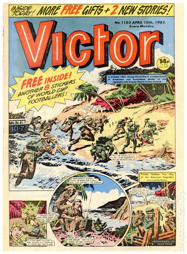 April 24, 1982. Published by D.C. Thompson and Co. Ltd. in Great Britain. Action/adventure stories feature the Quest of the Last Six Hundred, Johnny Gurkha, the Punch Pirate, Morgyn the Mighty, Legion of the Lost, Duke Farlow, Taneebo the Thunderbolt, and more. 8.5 x 11.75; black and white; 32 pages; 14p cover price.