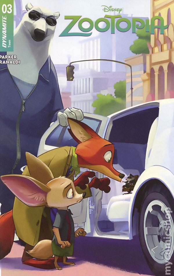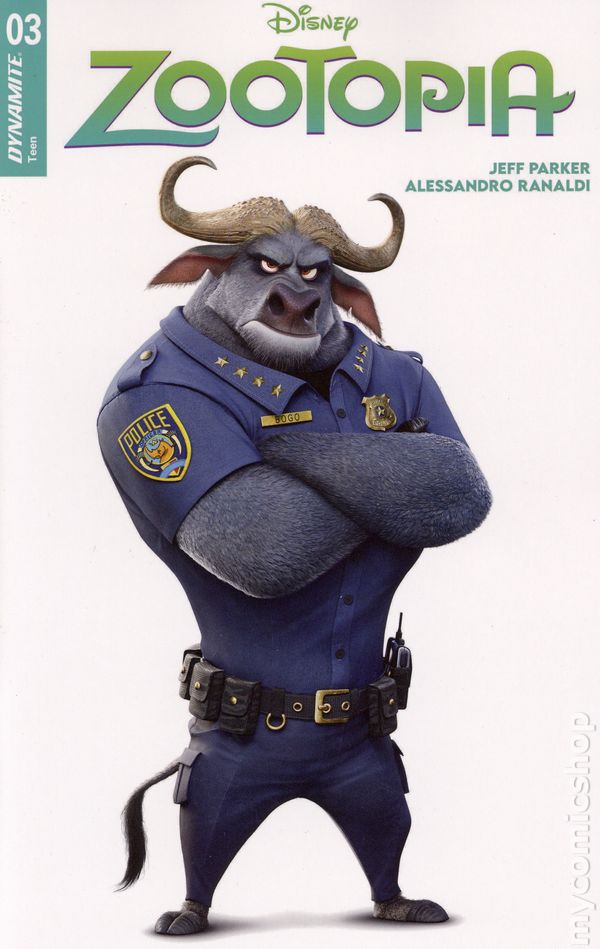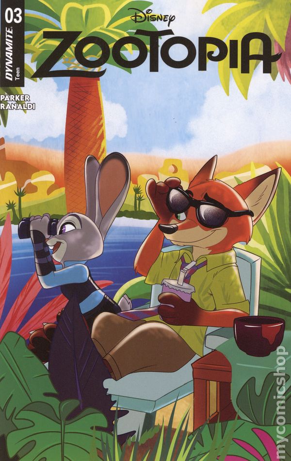 Written by Jeff Parker. Art by Alessandro Ranaldi. Movie Character Cover. Under interrogation, the raccoons busted in the great garbage heist at the Zootopia Recycling Depot reveal what their next target was going to be - and it's one of the fanciest vacation spots in the city! With the furry felons' contact inside the exclusive resort still a mystery, Officers Hopps and Wilde go undercover as new members to try and catch the culprit red-handed (or -pawed, or -hoofed). Their first discovery? It turns out that there are way worse places to conduct surveillance than lying poolside in a lounge chair with waiter service! 32 pages, full color. Rated T Cover price $4.99.