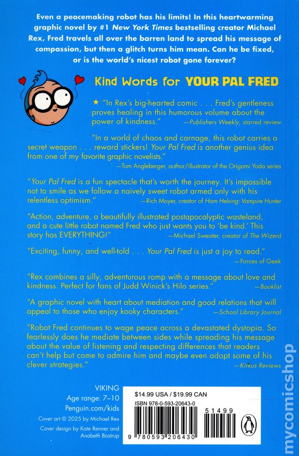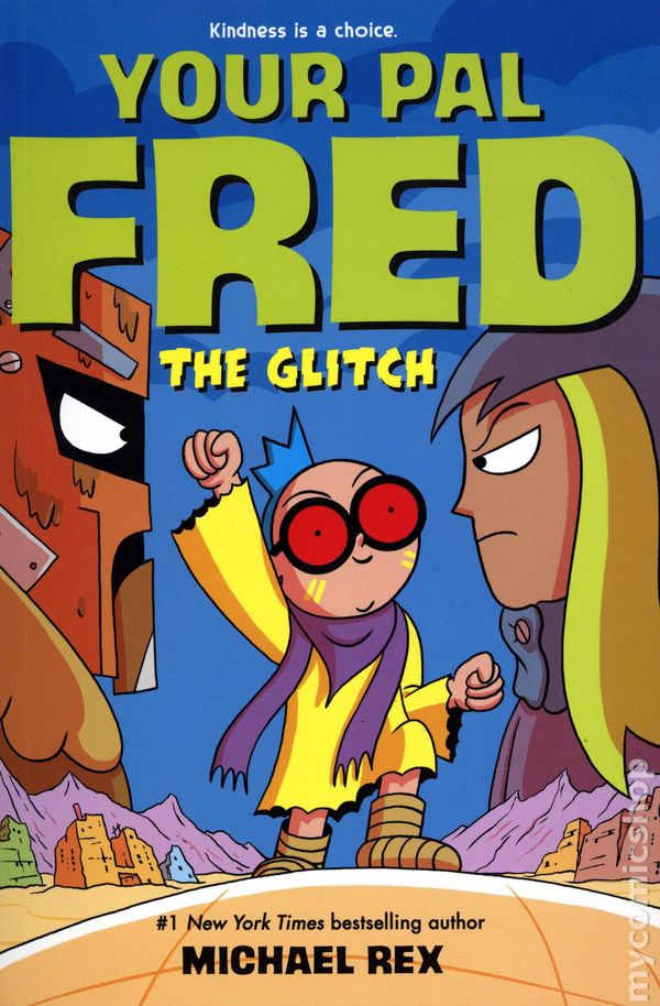 Volume 3 - 1st printing. "The Glitch!" Story and art by Michael Rex. Everyone knows about Fred and his mission to make the world a kinder place. In fact, the feel-good robot has never met a person he couldn't convince to play nice... until now. When Fred discovers the Tomorrow Sphere, a secret community that has survived the apocalypse in luxury-blankets! Medicine! Unlimited ice cream!-he's delighted that people in need can soon be helped. But despite all Fred's pleading, the Tomorrow Sphere leader absolutely, definitely, and totally refuses to share. This ultimate act of selfishness shocks Fred and causes him to glitch out and turn mean. If they won't share, he'll have to make them! With war looming and his friends in despair, it's up to Fred to fix his nasty glitch... or ruin all the goodness he's created in the world. Softcover, 5-in. x 7-in., 288 pages, full color. Cover price $14.99.