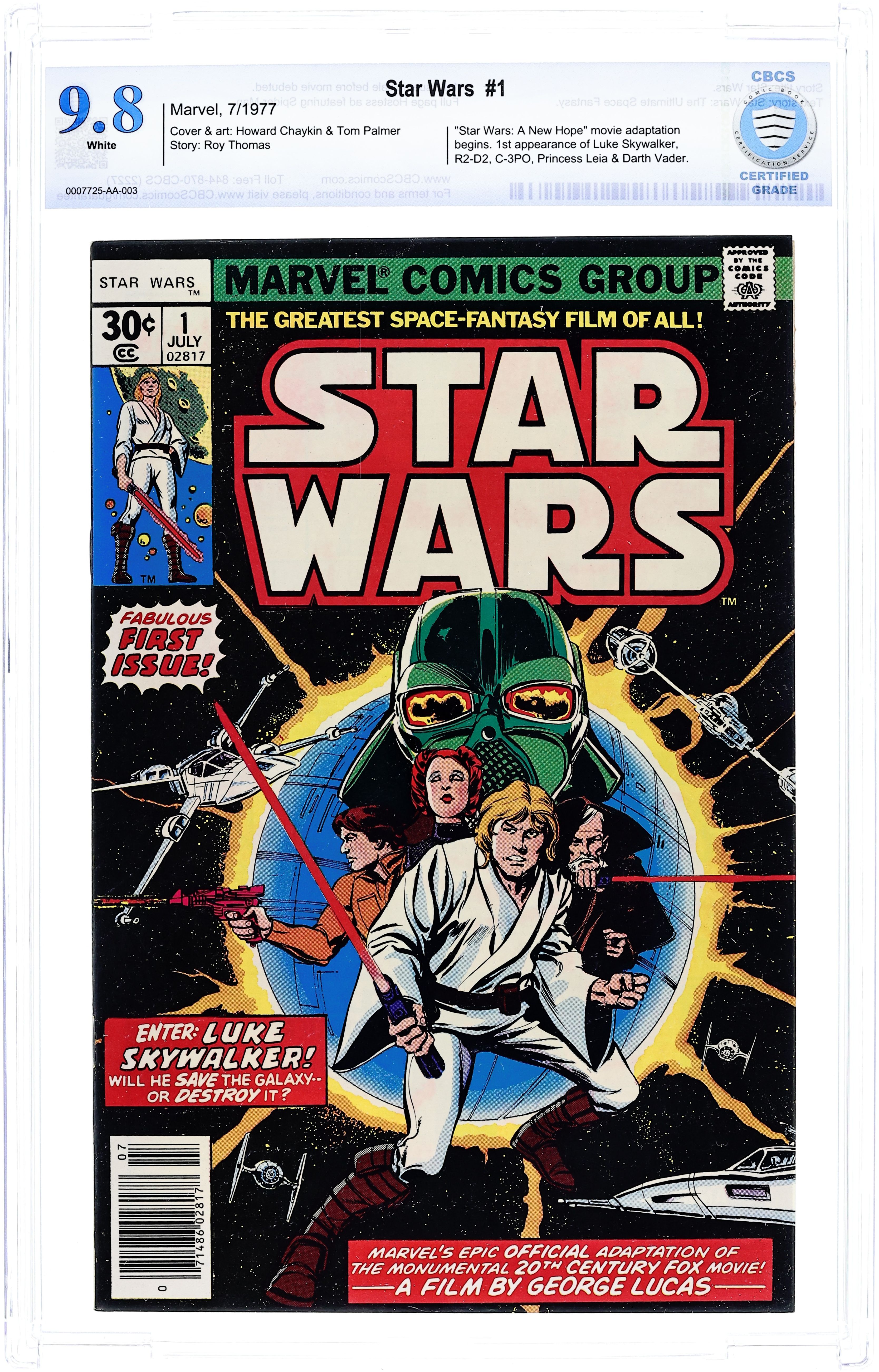 1st printing, standard 30 Cent Newsstand Edition with UPC. "A New Hope!" Part 1 of 6. Based on the screenplay by George Lucas. Adapted by Roy Thomas. Art by Howard Chaykin and Steve Leialoha.