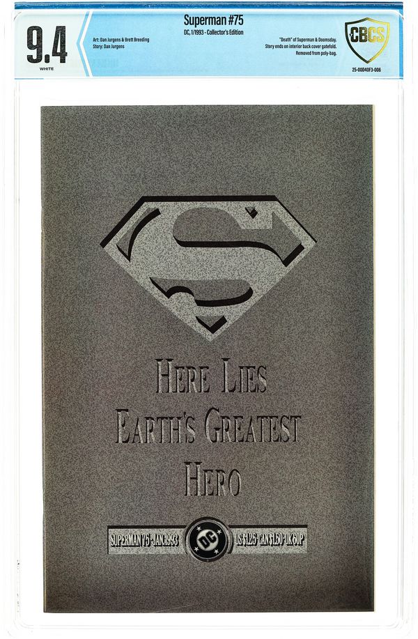 This is an unbagged version of Superman 75 Black Bag Memorial Edtion. 1st printing. Doomsday! Part 7 of 7. "Doomsday!" Story by Dan Jurgens. Art by Dan Jurgens and Brett Breeding. Here it is, the issue that rocked the DC Universe. An unstoppable force named Doomsday crash landed on Earth and has cut a swath of death and destruction across the country, all the way to Metropolis. Even the Justice League, the world's premiere super-team, was powerless before this creature's might. Now one man stands defiantly in Doomsday's way and vows that the creature's insanity stops here. Superman fights his strongest opponent to the death in the streets of Metropolis. NOTE: The event of "The Death of Superman" was so huge that it was reported on by the national media. - Odinson, Lonestar Comics Archivist Cover price $2.50.