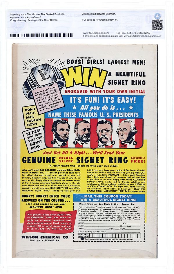 Cover pencils by Curt Swan, inks by Stan Kaye. The Monster That Stalked Smallville, script by Robert Bernstein, art by George Papp; Superboy brings a monster to Smallville as a friend, which upsets everybody in town. Aqua-Queen!, art by Ramona Fradon; After Aquaman doesn't pick her in a swimming meet, Dale Conroy vows to prove she's as good as he is. Revenge of the River Demon starring Congorilla, script by Robert Bernstein, art by Howard Sherman. 36 pages, Full Color. Cover price $0.10.