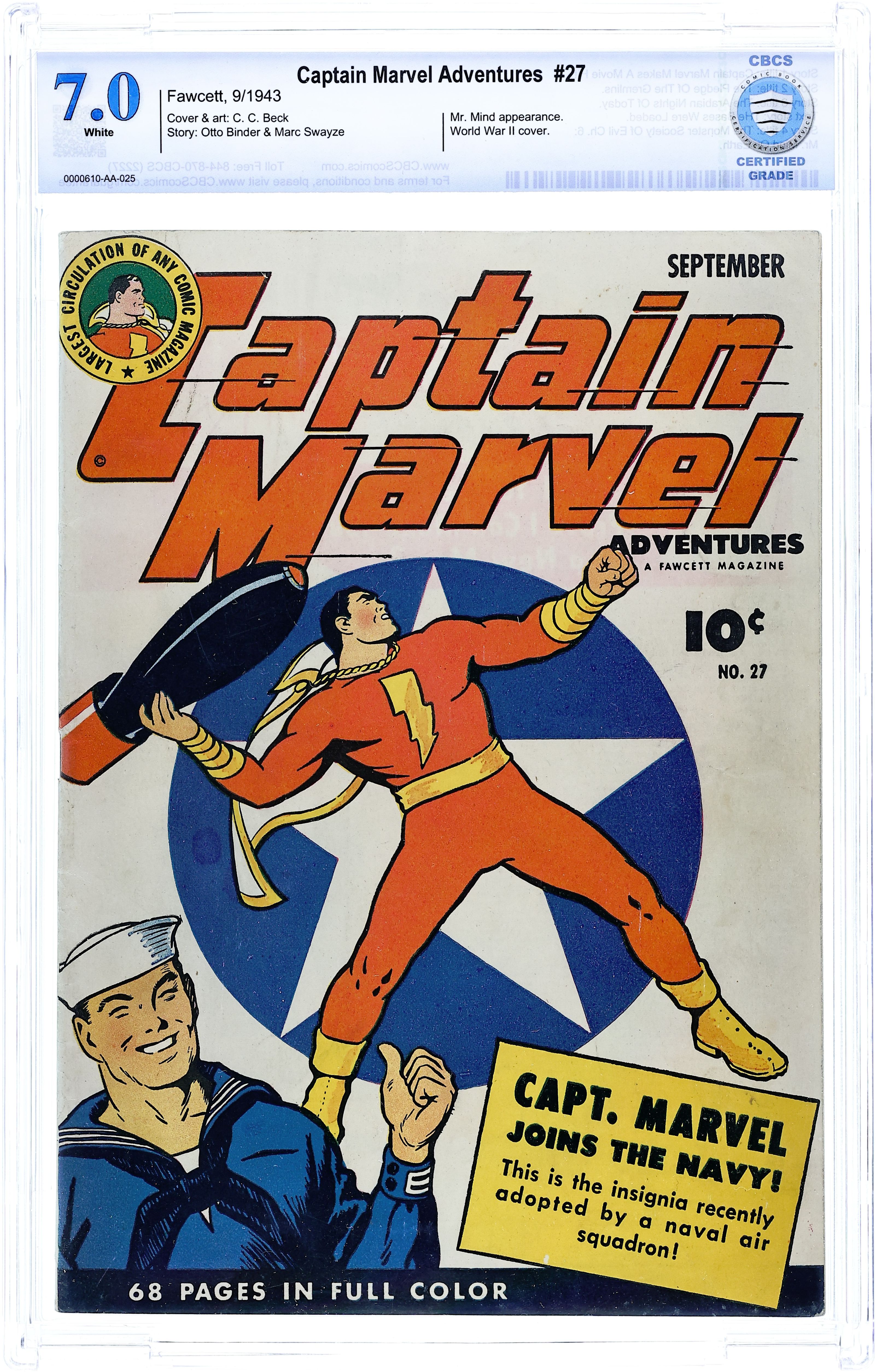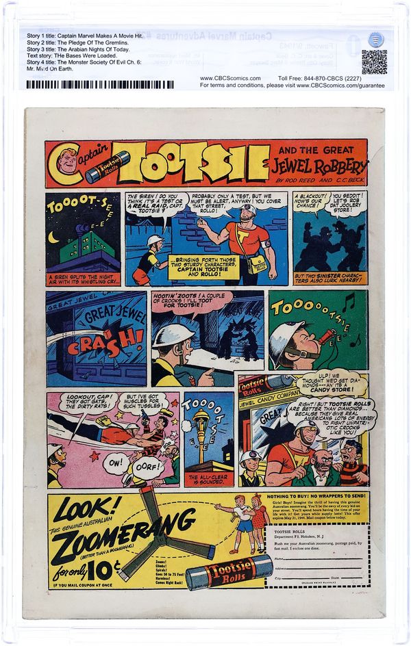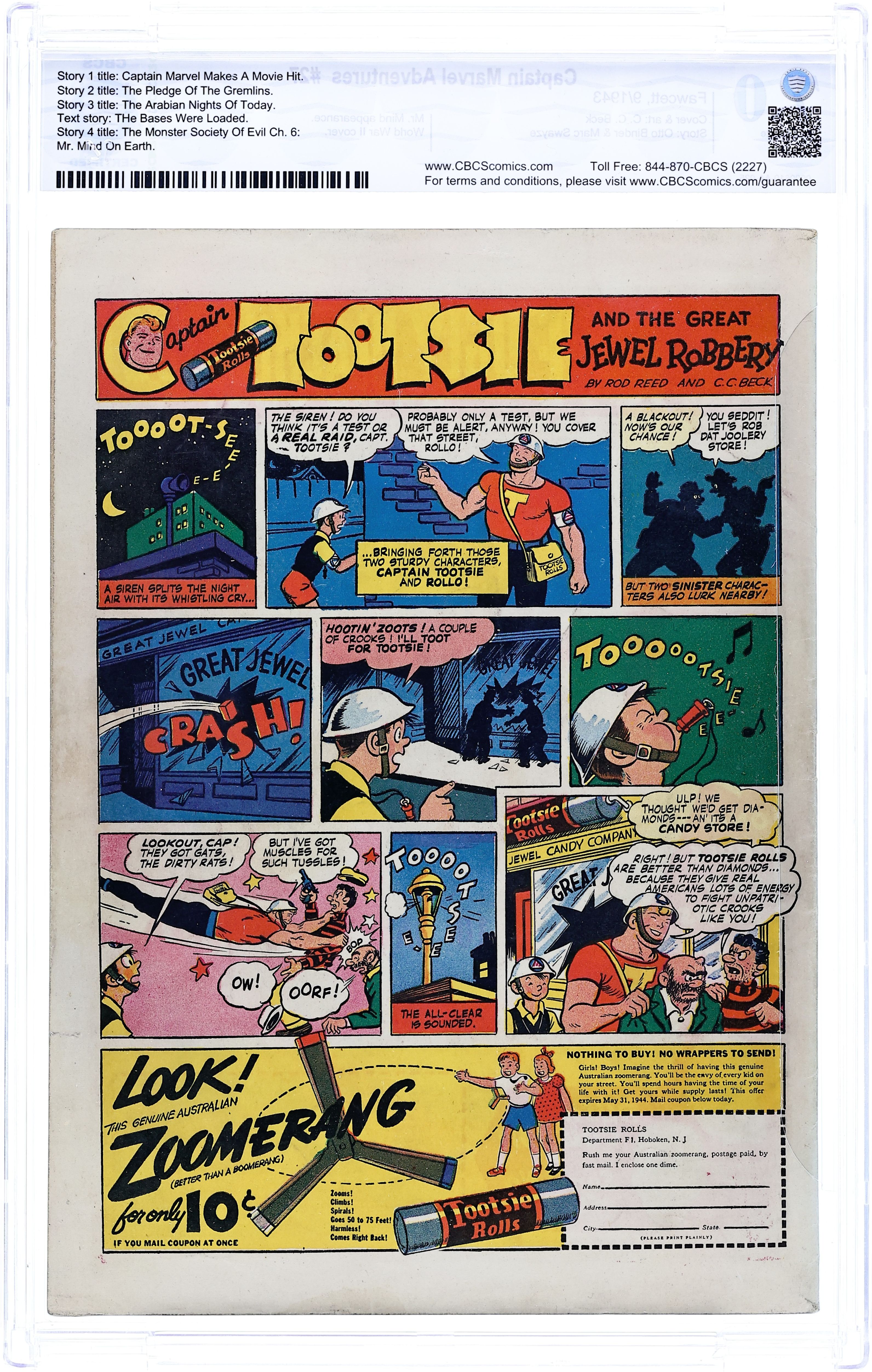 Cover by C.C. Beck. Stories by Otto Binder, Marc Swayze, Bert Whitman and unknown. Art by C.C. Beck, C.C. Beck Shop, Bert Whitman and unknown. Now on Earth, Mr. Mind uses his cosmic brain ray to command worms to eat away at the foundations of skyscrapers, causing them to collapse. Captain Marvel eventually discovers the villain hiding under his nose and decides to stop Mr. Mind once and for all by crushing him underfoot in "The Monster Society of Evil Chapter 6: Mr. Mind on Earth" by Otto Binder, C.C. Beck and C.C. Beck Shop. Captain Marvel also stars in: "Captain Marvel Makes a Movie Hit" with story by Otto Binder (Los Angeles city story); "The Pledge of the Gremlins" by Marc Swayze, C.C. Beck and C.C. Beck Shop; and "The Arabian Nights of Today" with story by Otto Binder. Plus: Little Sneezer in "De Code in de Dose!" by Bert Whitman; Captain Kid in an untitled 2-pager; and 2-page text story "The Bases Were Loaded" by Gary Brown. 68 Pages, Full Color. Cover price $0.10.