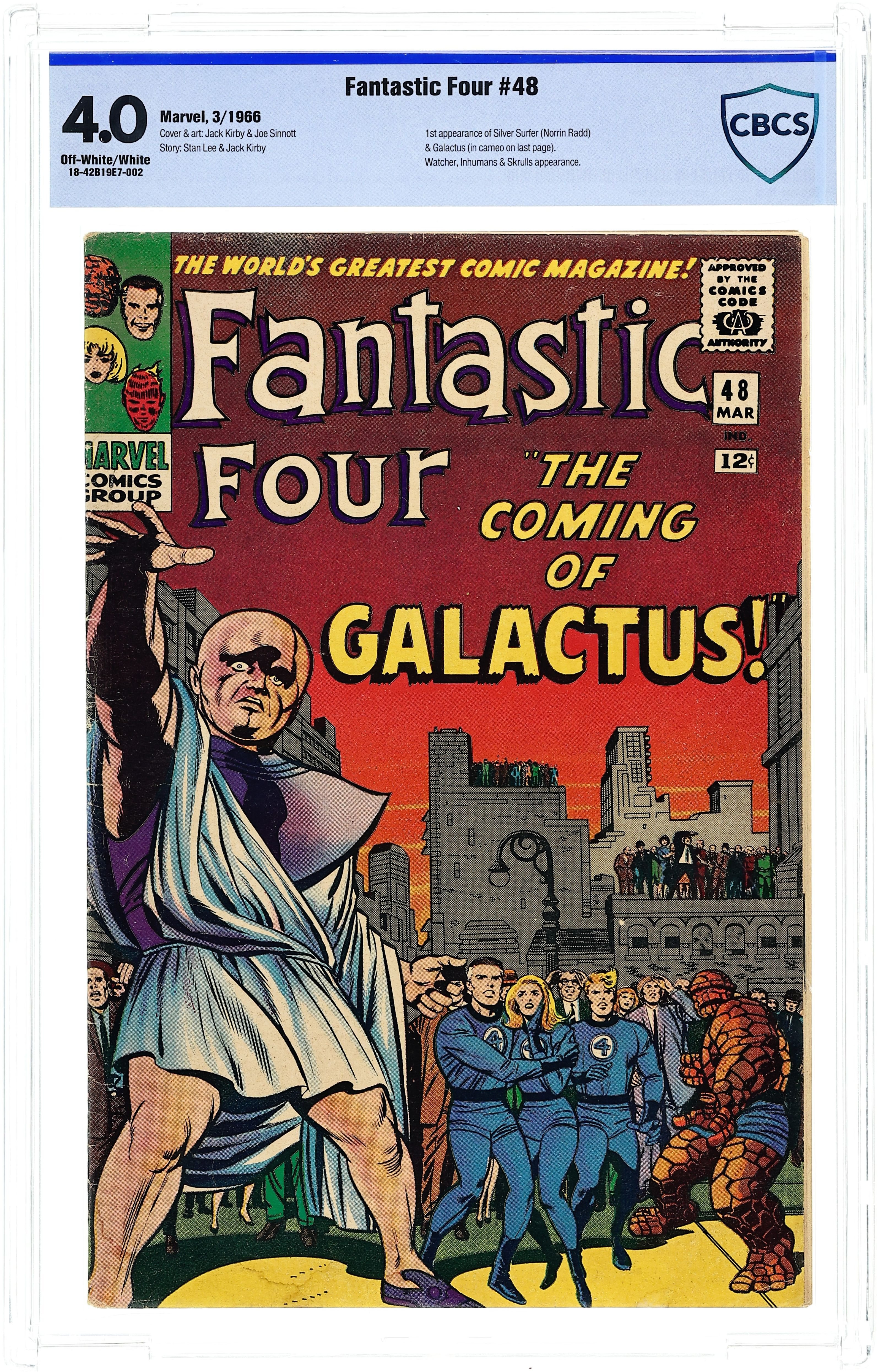 Cover pencils by Jack Kirby, inks by Joe Sinnott. First appearance of Galactus and the Silver Surfer in one of the most famous stories of the Silver Age, The Coming of Galactus!, script by Stan Lee, pencils by Jack Kirby, inks by Joe Sinnott; Black Bolt and the Fantastic Four put an end to Maximus's plan to destroy all the humans; Once the Fantastic Four return to New York the Watcher tells them of the coming danger of Galactus. Letter to the editor from comics writer Don McGregor. 36 pages, full color. Cover price $0.12.