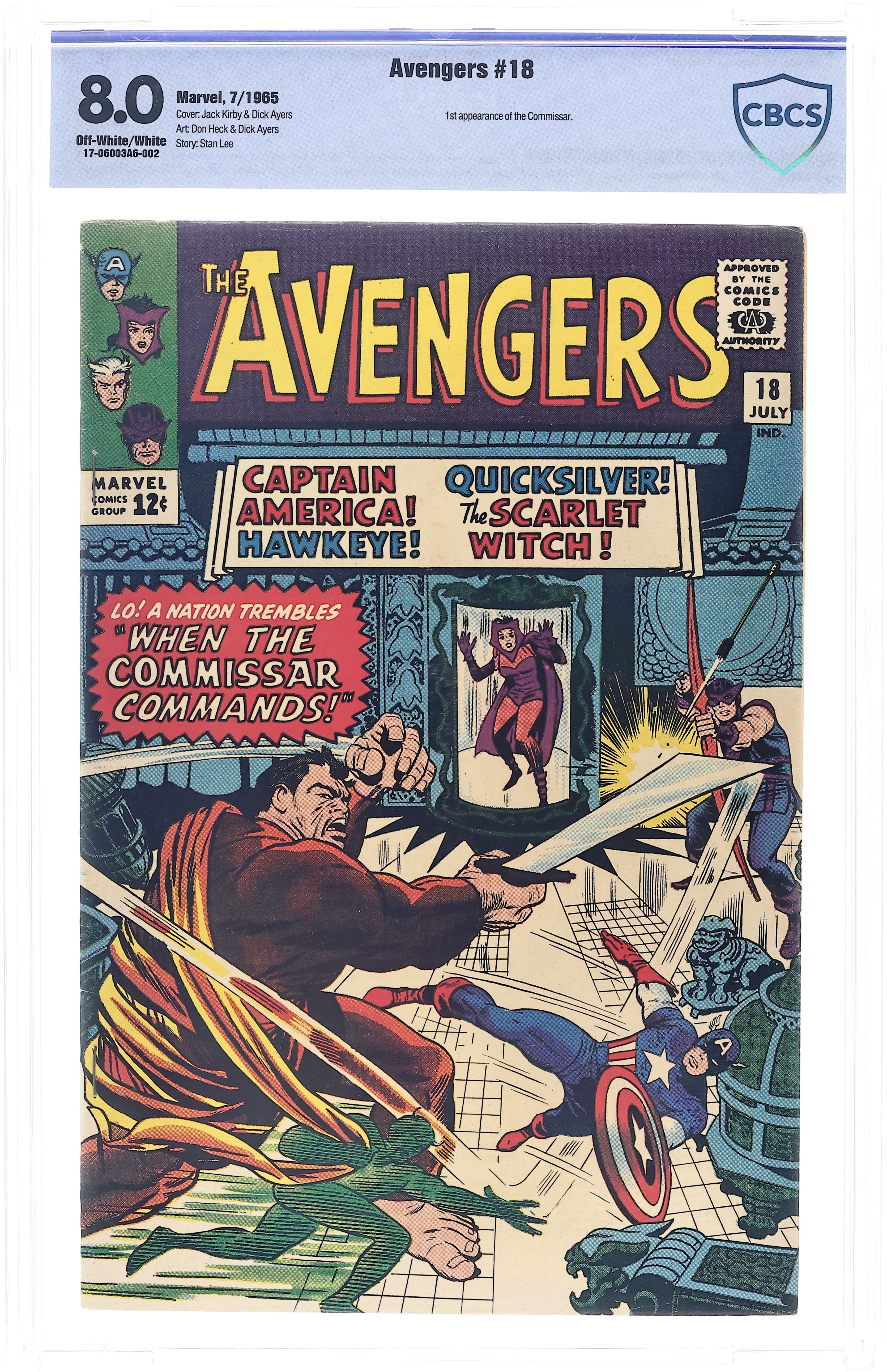 Cover pencils by Jack Kirby, inks by Dick Ayers. "When the Commissar Commands!", script by Stan Lee, pencils by Don Heck, inks by Dick Ayers; The Reds (evil commies) led by the monstrous Commissar are enslaving the peaceful land of Sin-Cong; The Avengers travel to that land to aid the people. Commissar defeats them all except the Scarlet Witch who discovers and destroys the Commissar's control panel, ending him. Avengers Roll Call: Captain America, Hawkeye, Quicksilver, and the Scarlet Witch. Appearance by Edwin Jarvis. Villains: Major Hoy and the Communists oppressors of Sin Cong (first and only appearance). Cameo by Nick Fury. Letter to the editor from Ted White (the writer?). Reprinted in Marvel Triple Action # 12. 36 pgs., full color. $0.12. Cover price $0.12.