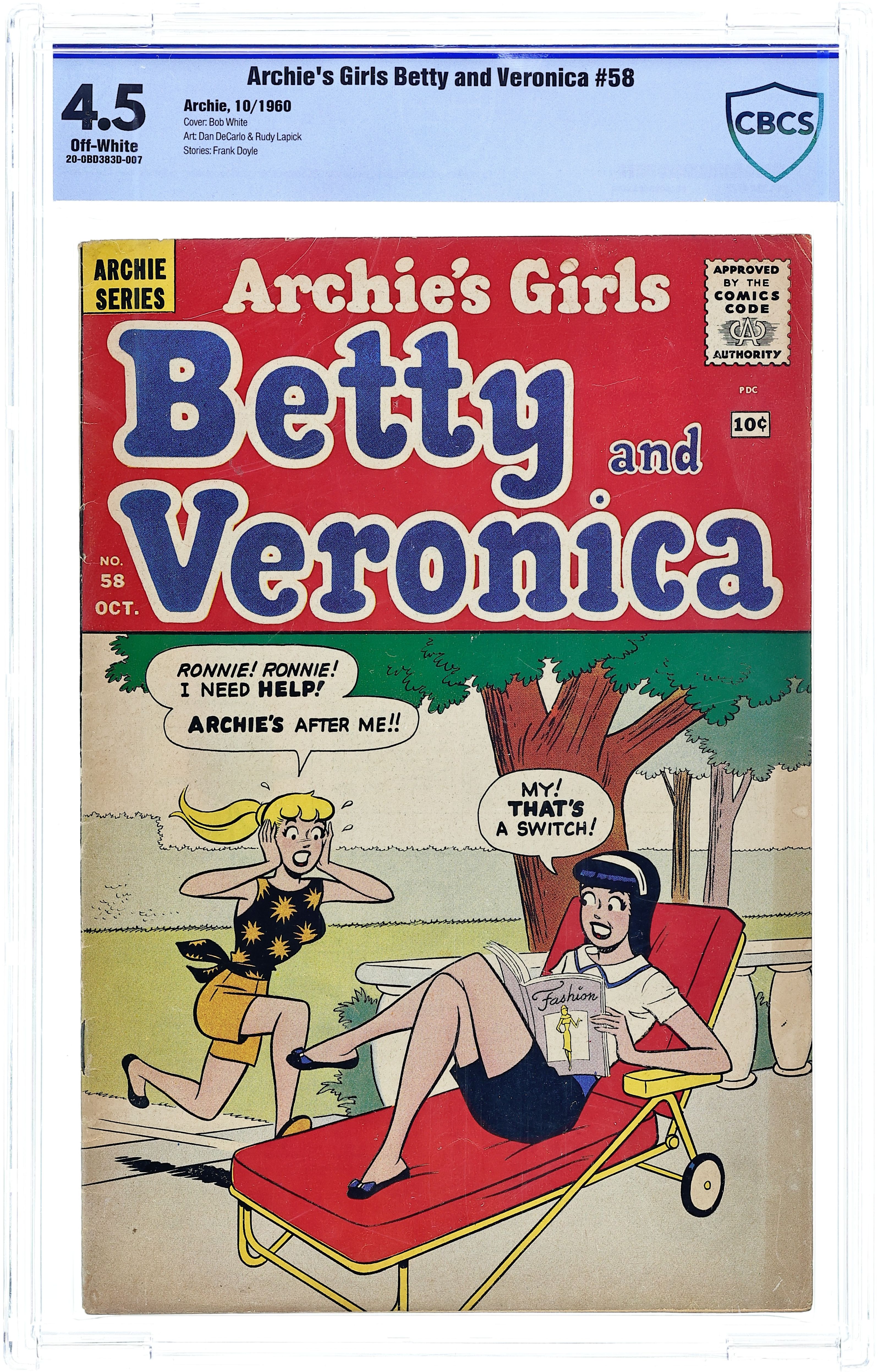 Cover art by Bob White. Happy Hallucination, script by Frank Doyle, pencils by Dan DeCarlo, inks by Rudy Lapick; Betty pleads with Veronica to occupy Archie while she gets the fender on Archie's jalopy fixed. The Saga Of Stag Island, script by Frank Doyle, pencils by Dan DeCarlo, inks by Rudy Lapick; The boys set up shop on an island in the river and declare it a males only island; Veronica takes it as a personal challenge to bust it up. Batter Up, script by Frank Doyle, pencils by Dan DeCarlo, inks by Rudy Lapick; Betty and Veronica try to explain tennis to Jughead. 36 pgs. $0.10. Cover price $0.12.