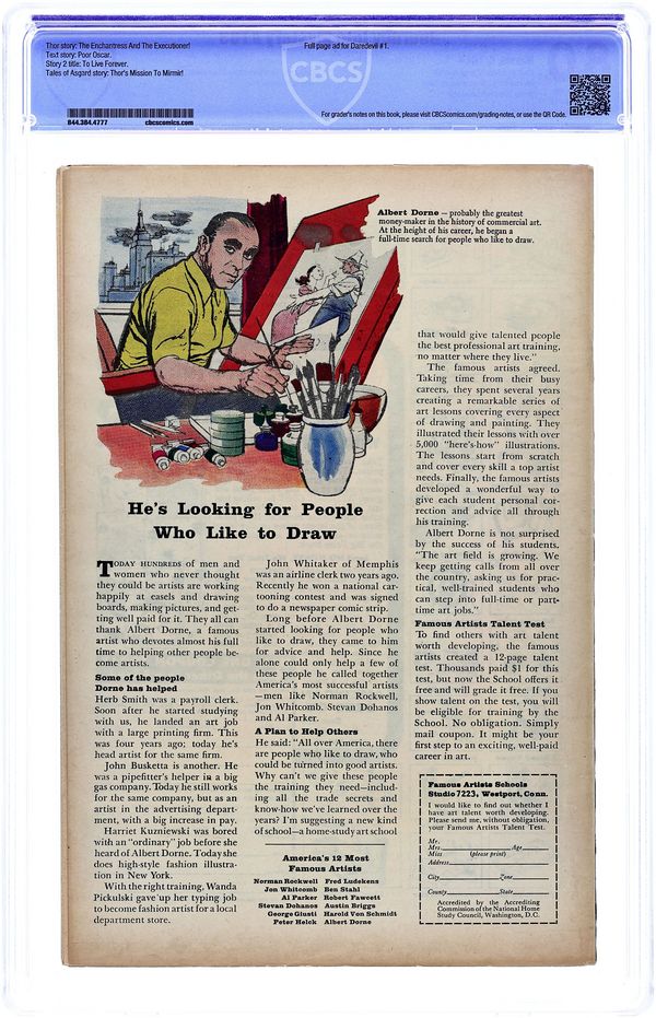 Cover pencils by Jack Kirby, inks by George Roussos. "The Enchantress and the Executioner!", script by Stan Lee, pencils by Jack Kirby, inks by Chic Stone; Loki and Odin conspire to end Thor's infatuation with Jane Foster by sending the Enchantress to seduce him away from his mortal love; The heavy handed Executioner fouls things up and the mission is unsuccessful; features the first appearance of the two title characters. "Poor Oscar" text story. "To Live Forever!", script by Stan Lee (plot) and Larry Lieber (script), pencils by Larry Lieber, inks by Chic Stone; In a future where capital punishment has been abolished, the maximum sentence is 90 years imprisonment; A brilliant scientist decides to find a way to make himself immortal, so he may commit crimes with impunity, but turns himself into a rock. This issue also has a statement of ownership: average print run 318,413; average paid circulation 187,740. "Thor's Mission to Mirmir!", script by Stan Lee, pencils by Jack Kirby, inks by Chic Stone; Thor must reach Mirmir to tell him that Odin has decided it is time to create the human race. 36 pgs., full color. Cover price $0.12.
