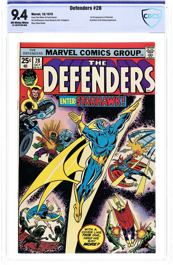 Cover pencils by Ron Wilson, inks by Frank Giacoia. First full appearance of Starhawk in My Mother, The Badoon!, script by Steve Gerber, pencils by Sal Buscema (layouts/breakdowns), Frank Giacoia (Finished Art), and John Tartaglione [as John Tartag] (Finished Art), inks by Frank Giacoia and John Tartaglione [as John Tartag]; Nighthawk, Charlie-27 and Martinex are captured by the Badoon; Starhawk helps Vance Astro and Valkyrie return to Earth; Hulk and Yondu are forced to enter the Super-Death Sweepstakes. 36 pgs. $0.25. Cover price $0.25.