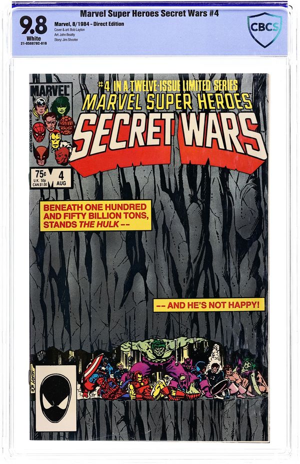 Direct Edition. "Situation Hopeless!" Part 4 of 12. Story by Jim Shooter. Art by Bob Layton and John Beatty. The villains' sneak attack has sent the heroes reeling. And for the coup de grace, the Molecule Man drops an entire mountain range on Captain America and his injured comrades. The only thing standing between the heroes and final oblivion is the monstrous strength of the Incredible Hulk. But, does even the Green Goliath have the strength to hold back fifty billion tons of rock and earth? Meanwhile, the X-Men seek out Magneto and the Mighty Thor stands alone against the deadliest villains in the Marvel Universe. 36 pages, full color. Cover price $0.75.