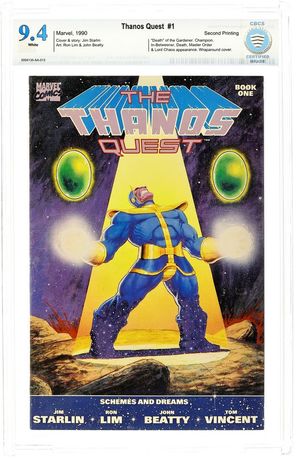 2nd Printing. "Schemes and Dreams!" Written by Jim Starlin. Art by Ron Lim John Beatty. Six Soul Gems. NOTE: This tale picks up after the events of Silver Surfer (1987 2nd Series) #38. Thanos the Mad Titan has been resurrected by the entity known as Death. Resurrected and given a dark mission. In order to accomplish this mission, Thanos will seek ultimate power - the Soul Gems! Individually, they contain power beyond comprehension. Together, they could destroy a universe. And Thanos must have them all. Featuring the Elders of the Universe Champion and Gardiner, and the nefarious In-Betweener. 48 pages, FC. Cover price $4.95.