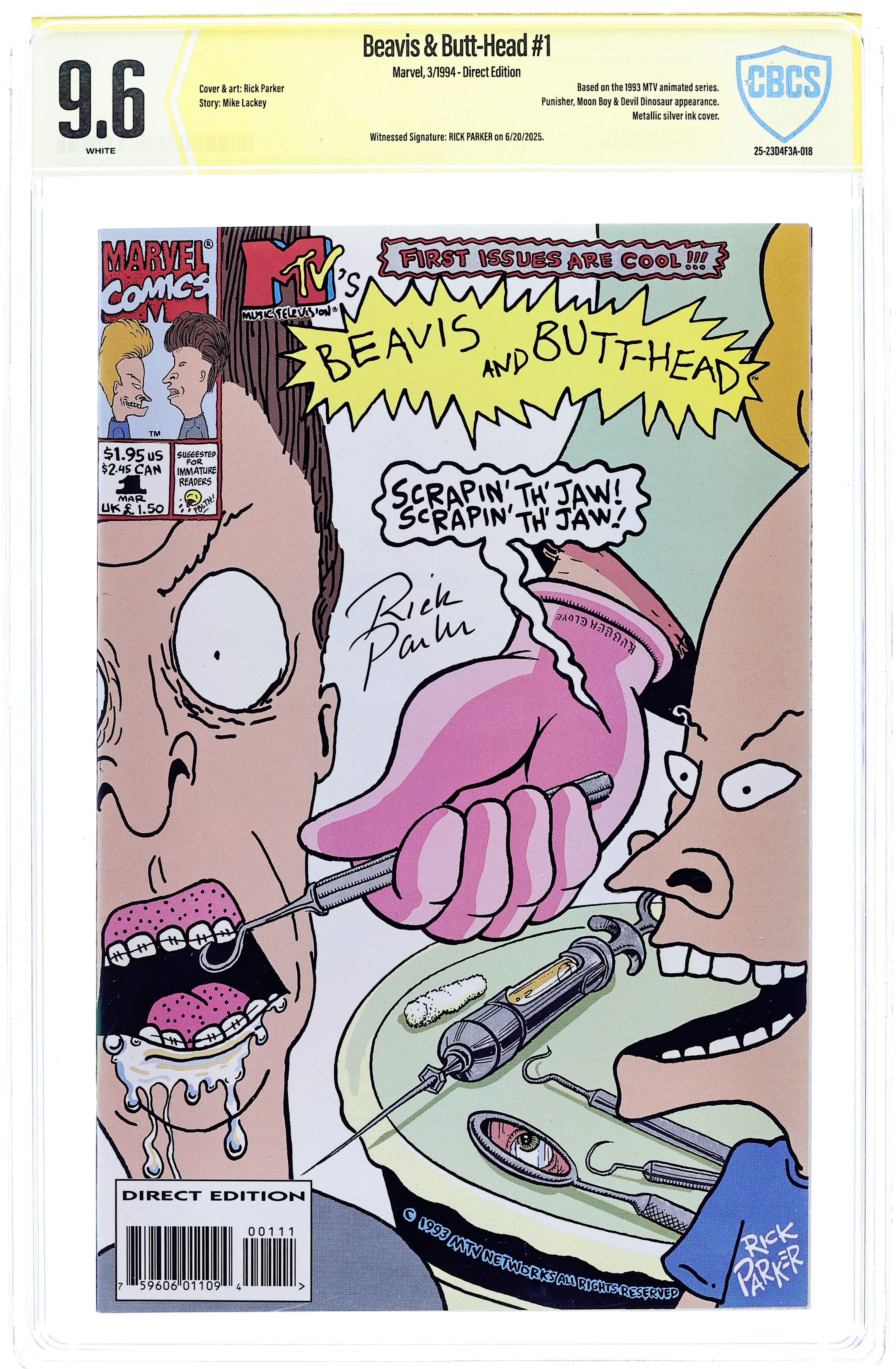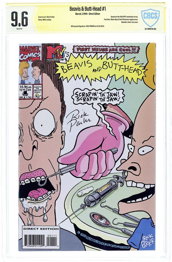 First Printing. Direct Edition. Cover art by Rick Parker. Dental Hygiene Dilemma - Fart One, script by Mike Lackey, art by Rick Parker; Beavis and Butt-Head visit a yam-stuffed Maxi-Mart where they have an altercation with the clerk. The Punisher Parody one-pager. An advertisement for the Swedish band "Entombed" and the new limited-edition version of their "Wolverine Blues" CD. Dental Hygiene Dilemma - Part Two. Silver ink cover, first printing. Devil Dinosaur parody. 36 pgs. $1.95. Cover price $1.95.