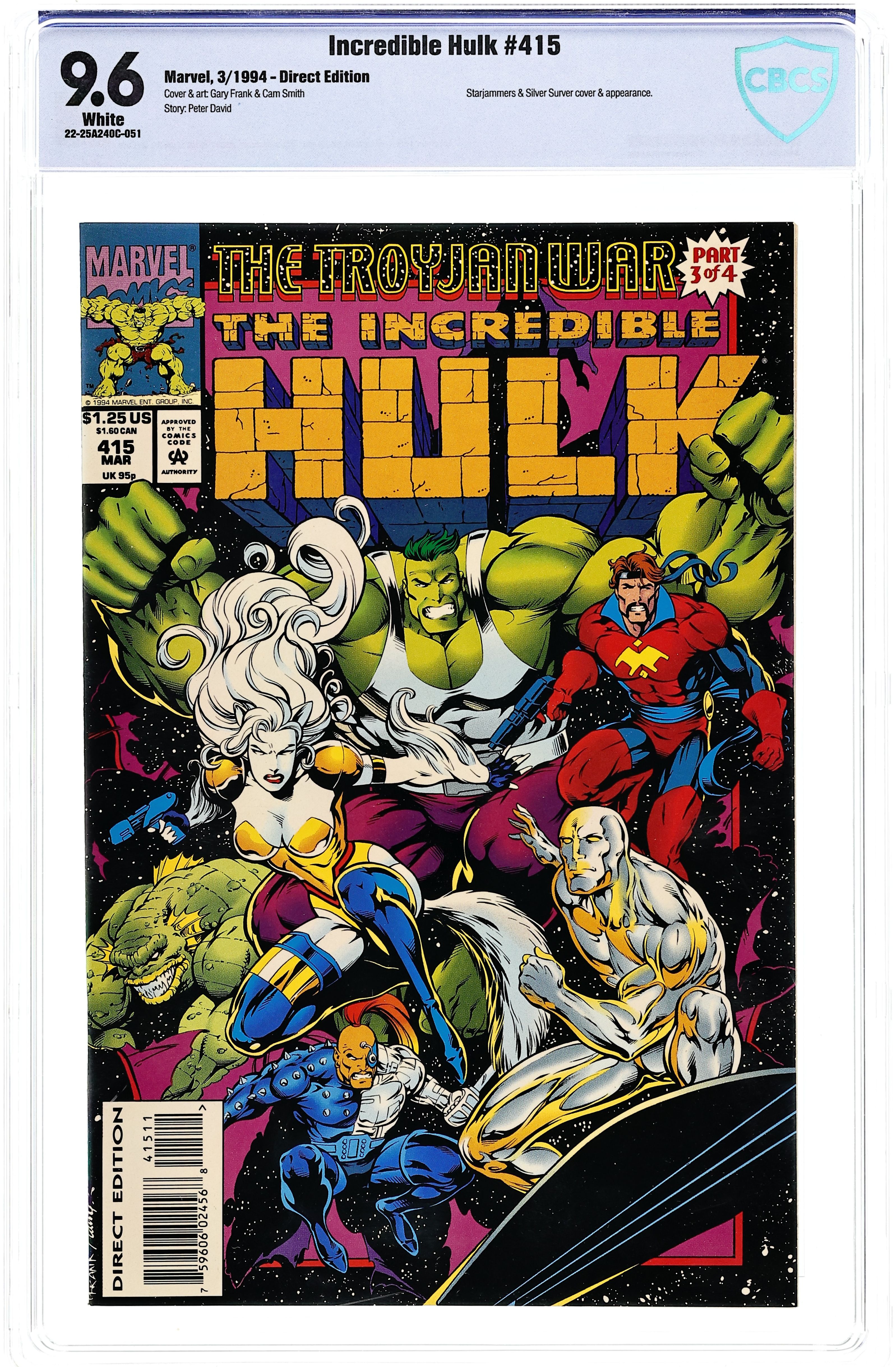 Cover pencils by Gary Frank, inks by Cam Smith. The Troyjan War Part 3: Jammin', script by Peter David, pencils by Gary Frank, inks by Cam Smith; Hulk and Silver Surfer are picked up in space by the Starjammers and head toward the Troyjan homeworld; Trauma captures the Pantheon and returns home to his father; Things get complicated as Lord Armageddon explains that he is the power behind Pantheon leader Agamemnon and if Atalanta refuses to marry his son, he will rescind the longevity he has granted to the Pantheon members and they will be destroyed; Meanwhile, back on earth, Janis meets Rick. 36 pgs. $1.25. Cover price $1.25.
