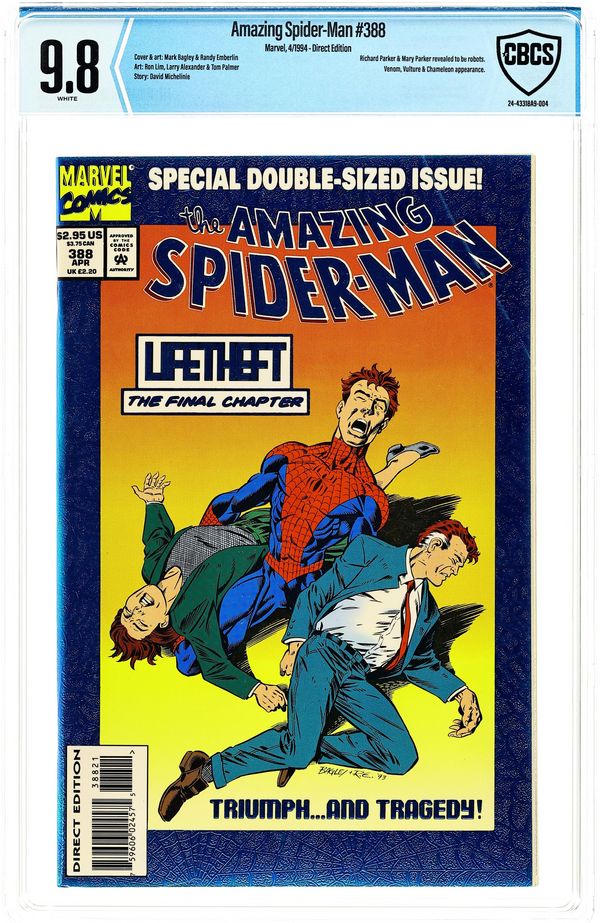 Deluxe Direct Edition. "The Sadness of Truth" Life theft Part 3 of 3. Double-sized issue. Direct Edition. Script by David Michelinie. Pencils by Mark Bagley. Inks by Randy Emberlin. Blue foil cover by Mark Bagley and Randy Emberlin. Shock follows shock as Peter Parker learns the painful truth about his parents! Inside the Chameleon's New Jersey hideaway, the faceless villain reveals that Richard and Mary Parker are artificial simulacrums (aka life model decoys). The web-slinger is stunned. But there's no time for sorrow as the wall-crawler must stop his "parents" from revealing his secret identity! Once the Chameleon morphs Richard into a killing machine the battle lines are drawn: the Vulture, the Chameleon, and the Richard LMD vs. the Amazing Spider-Man! As the fight progresses, could a mother's love -- even the love from an artificial mom -- propel her web-spinning son to victory? A heartbreaking ending for all. Final appearances of the Richard Parker and Mary Parker life model decoys. Cameo appearances by Aunt May and Mary Jane Watson. Elements of the story continue in Spider-Man 45. Second story: "The Lost Days" Script by David Michelinie. Art by Ron Lim (breakdowns)and Tom Palmer (finishes). This story provides details of Venom's activities prior to Amazing Spider-Man 300. Flashback cameo by Peter Parker. Third story: "My Enemy's Enemy" Script by David Michelinie. Art by Larry Alexander. Cardiac and Chance attack the same corrupt corporation with different ideas about how to put it out of business! (Note: This issue completes David Michelinie's unparalleled 7-year run as the writer of the Amazing Spider-Man title -- highlighted by Peter and Mary Jane's wedding, the co-creation of Venom, and the introduction of Peter Parker's parents.) 68 pages. Cover price $2.95.