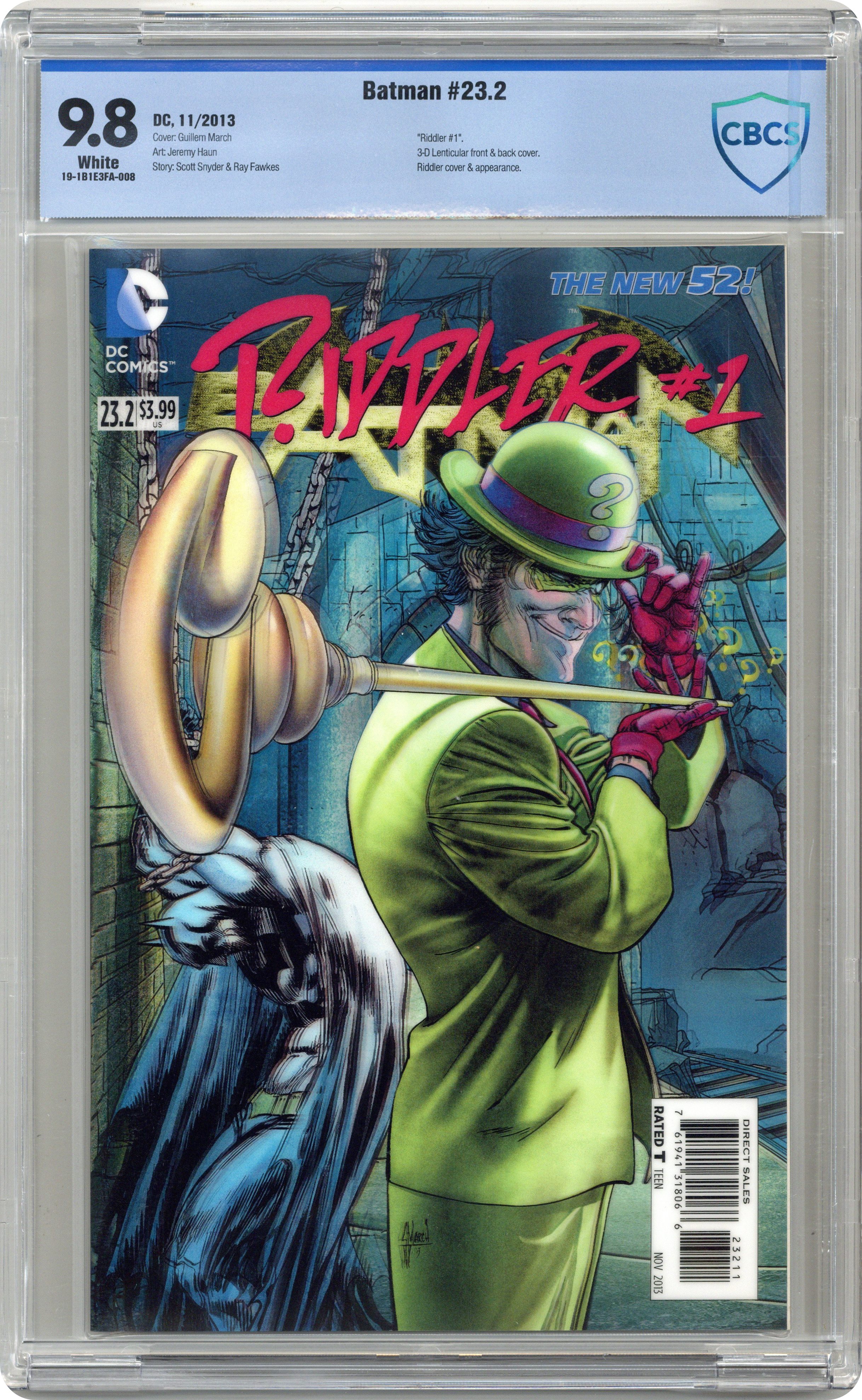 3D COVER (W) Scott Snyder, Ray Fawkes (A) Jeremy Haun (CA) Guillem March With The Dark Knight out of the picture, The Riddler engages in an epic game of wits. Learn what maddening early moments led a young Edward Nygma to evolve into Gotham City's Prince of Mischief! And see how events of ZERO YEAR continue to affect The Riddler today! Cover price $2.99.