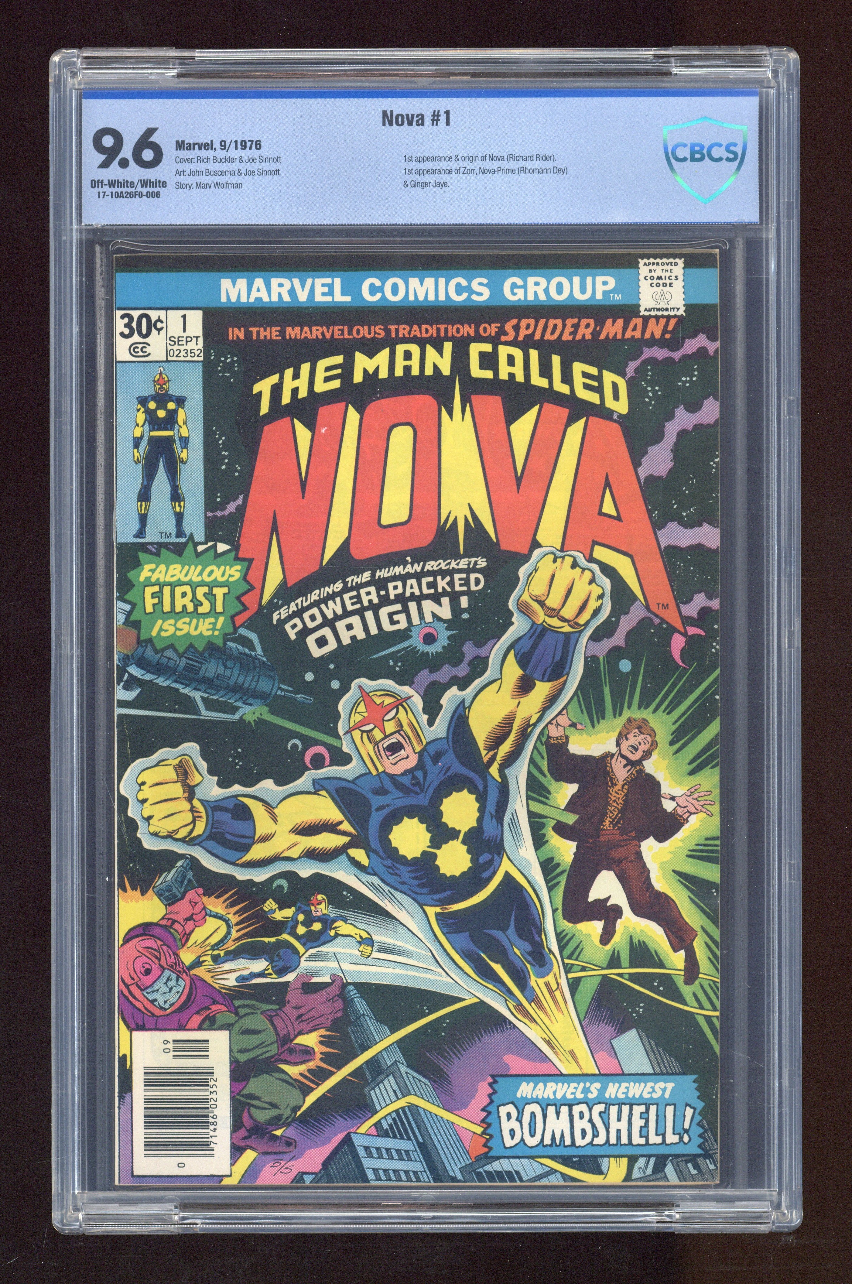 Ends Jan 14 7:53 PM CST Bid History 6 bids Current Bid $410 Your Secret Max Bid If you'd like to bid, please log in or register. Written by Marv Wolfman. Pencils by John Buscema. Inks Joe Sinnott. When a dying alien passes on his super-powers to Earth teenager Richard Rider, Rider becomes the man called Nova, the human rocket! In the marvelous tradition of Spider-man, Nova must now stop the murderous alien known as Zorr, or Earth is doomed! Note: First appearance of Nova. 36 pages, full color. Cover price $0.30.
