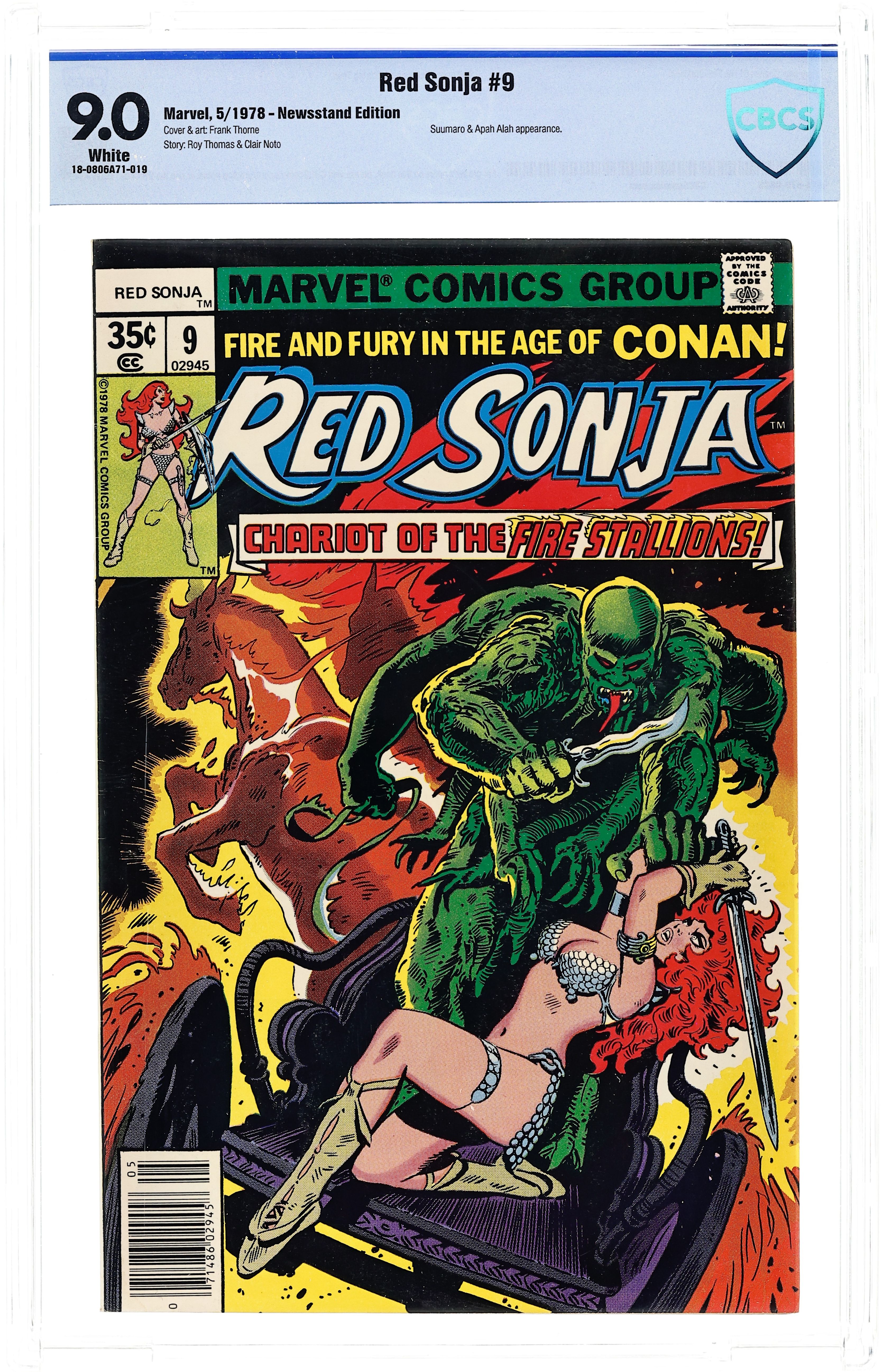 Cover by Frank Thorne. The Demon of the Maze, script by Roy Thomas and Clara Noto, art by Frank Thorne; Red Sonja comes to the port city of Venzia in the kingdom of Argos; After witnessing two sailing vessels crashing into one another, she rescues a young woman from a couple of street brigands; Moments later, a mute thug clobbers Sonja across the back of the head and brings her to the dungeon of a mage known as the Hidden One; When Sonja awakens, she finds herself trapped in a strange maze of mirrors and illusions. Spider-Man stars in a one-page Hostess ad, "The Champ." 36 pgs., full color. $0.30. Cover price $0.30.