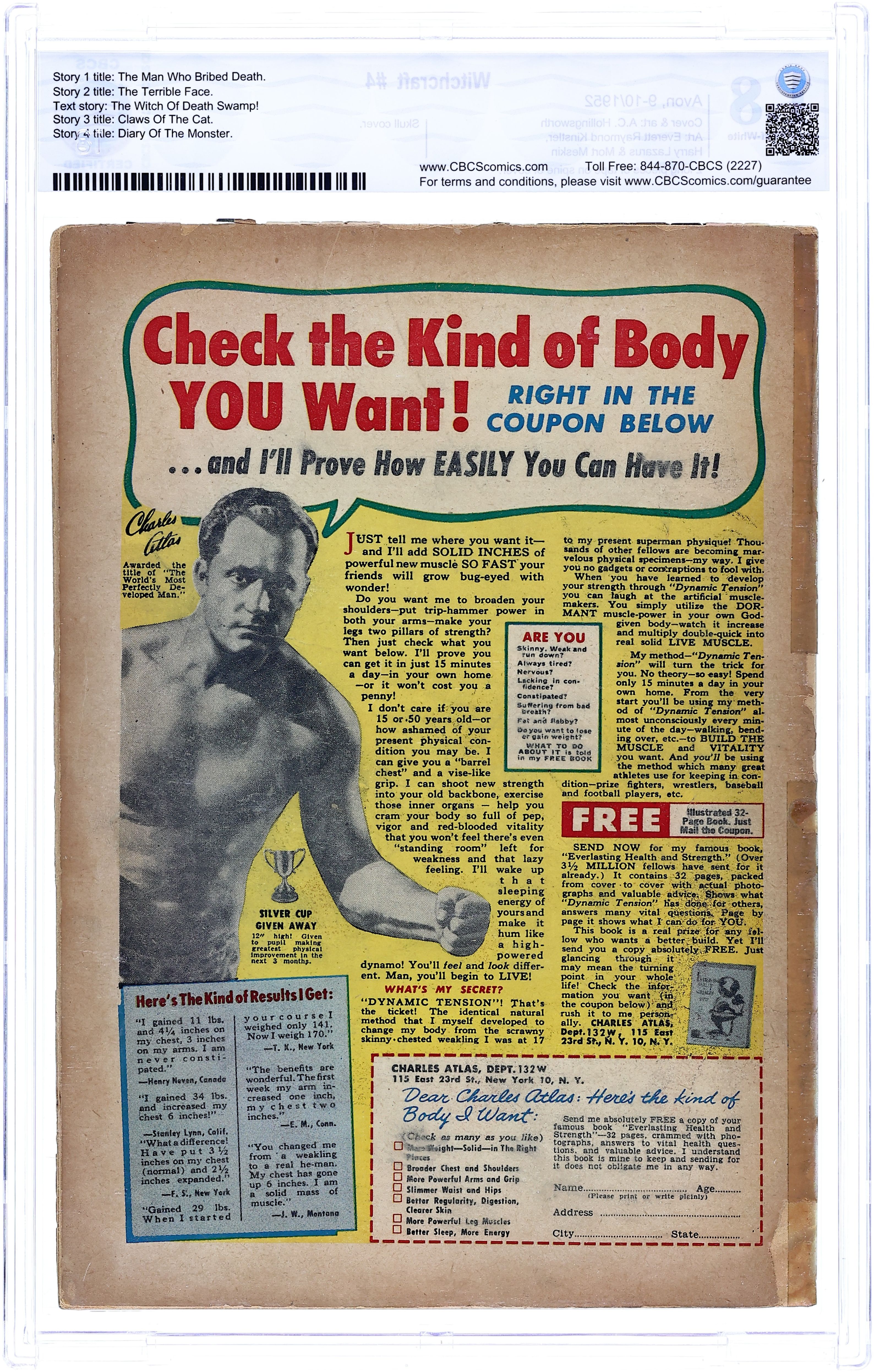 Art by Everett Raymond Kinstler, Alvin C. Hollingsworth, Mort Meskin, George Roussos and Harry Lazarus. Cover by A. C. Hollingsworth. Tales of pre-Code horror, curses, and spells. A dying man makes a bargain with death, but now he must kill others to stay alive; A jealous plastic surgeon disfigures his romantic rival, but his own inner ugliness comes to the surface; No one believes an arsonists claims that he is possessed by a fire monster. Also featuring a spooky contents page illustrated by Everett Raymond Kinstler on the inside front cover, including a skeleton in a top hat & tuxedo and an evil cat. Witchcraft; The Man Who Bribed Death; The Terrible Face; The Witch of Death Swamp!; Claws of the Cat; The Thing Beneath the Earth; Diary of the Monster! 36 pages, full color. Cover price $0.10.