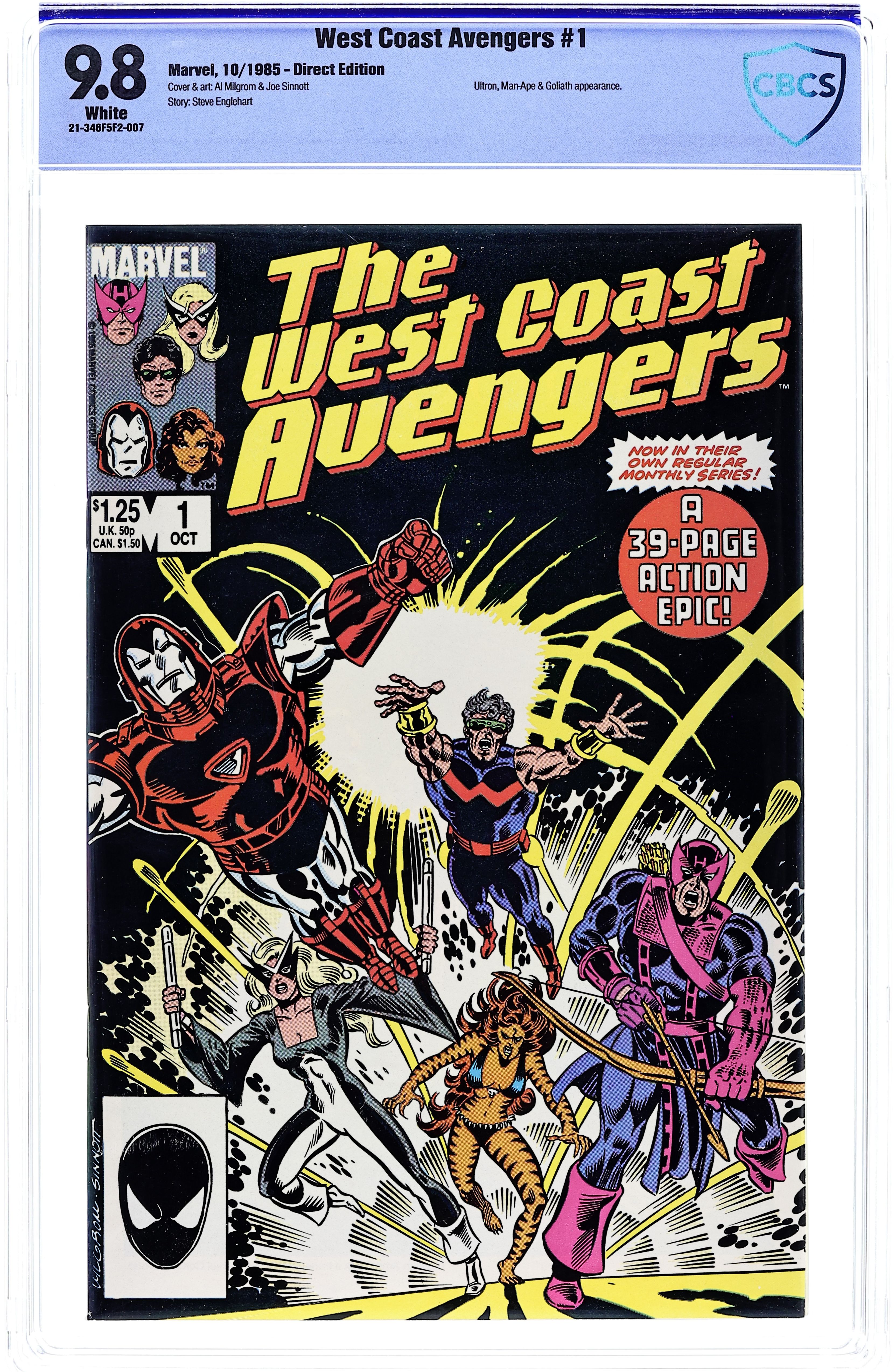 Direct Edition. "Teammates!" Story by Steve Englehart. Art by Al Milgrom and Joe Sinnott. The Avengers West Coast team explodes on the scene with their own monthly series. This new team, with leader Hawkeye, consists of Mockingbird, former S.H.I.E.L.D. agent and Hawkeye's wife, Iron Man, founding member of the original team and now in his new red and silver Centurion Armor, Wonder Man, super humanly strong and renown actor, and Tigra, a cat-woman whose appetite for men is rivaled only by her speed and agility. When Hank Pym (former Giant-Man) comes to visit his ex-teammates, the Man-Ape attacks freeing the ionically powered Goliath (he was captured in Iron Man Annual #7). Things get worse when one of the Avenger's oldest foes leads the attack. Ultron, the nigh-unstoppable killing machine has come for his father. 48 pages. Cover price $1.25.