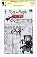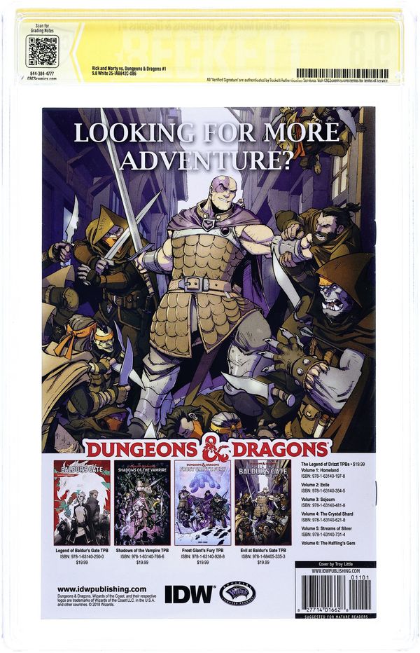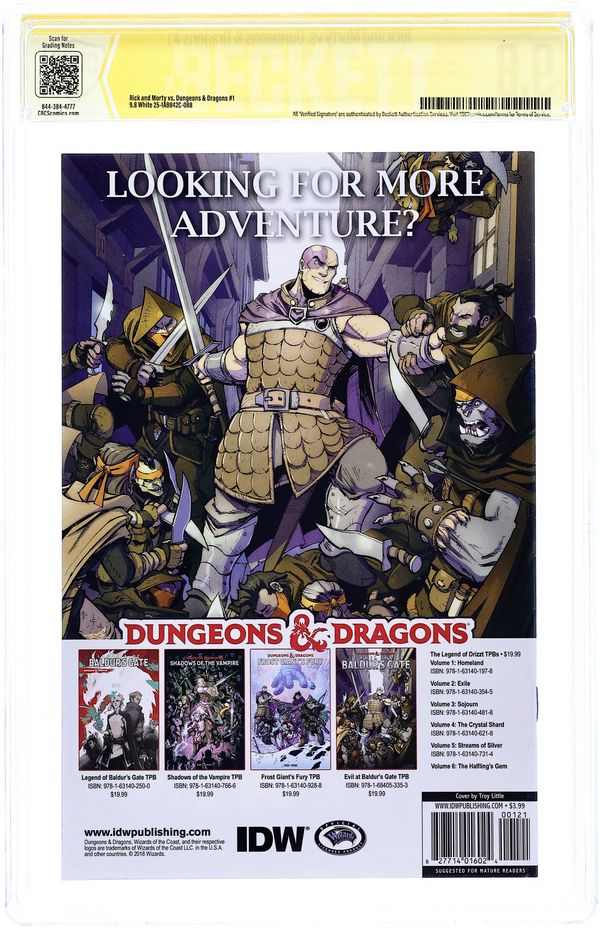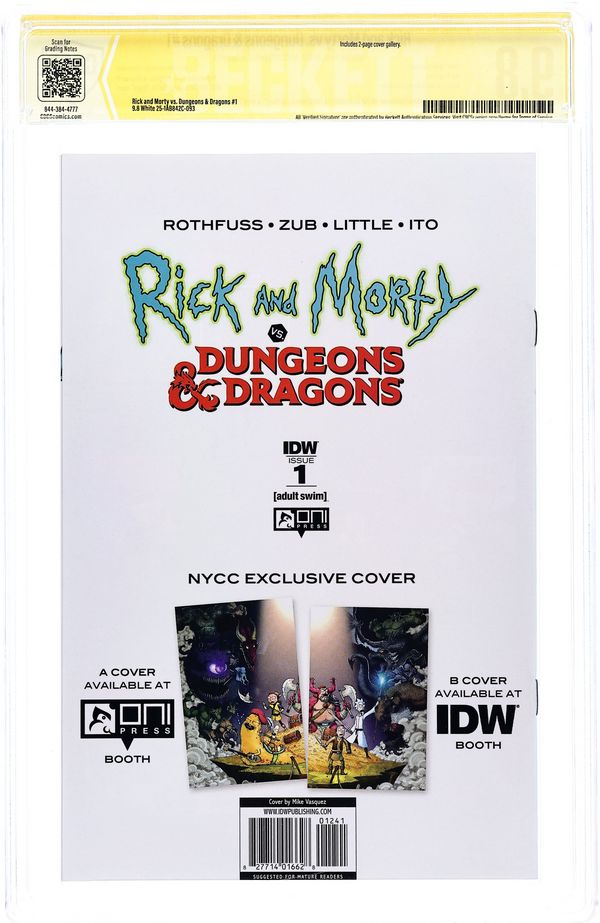 New York Comic Con 2018 Exclusive Connecting Virgin Variant "A" Cover by Mike Vasquez. Written by Patrick Rothfuss and Jim Zub. Art by Troy Little. When Morty needs to learn how to play D&D to keep up with the cool kids, his hard-drinking, old school-gaming, mad science-making grandpa is happy to teach him how to roll the dice, but neither of them is prepared for the saving throws they're about to fail or the true quest yet to come. Strap on a +1 longsword and grab your 10-foot pole, because this is going to be a gaming gauntlet like no other! The world's greatest role-playing game. Reality's most dysfunctional family. What could go wrong? 28 pages, full color. Mature Readers