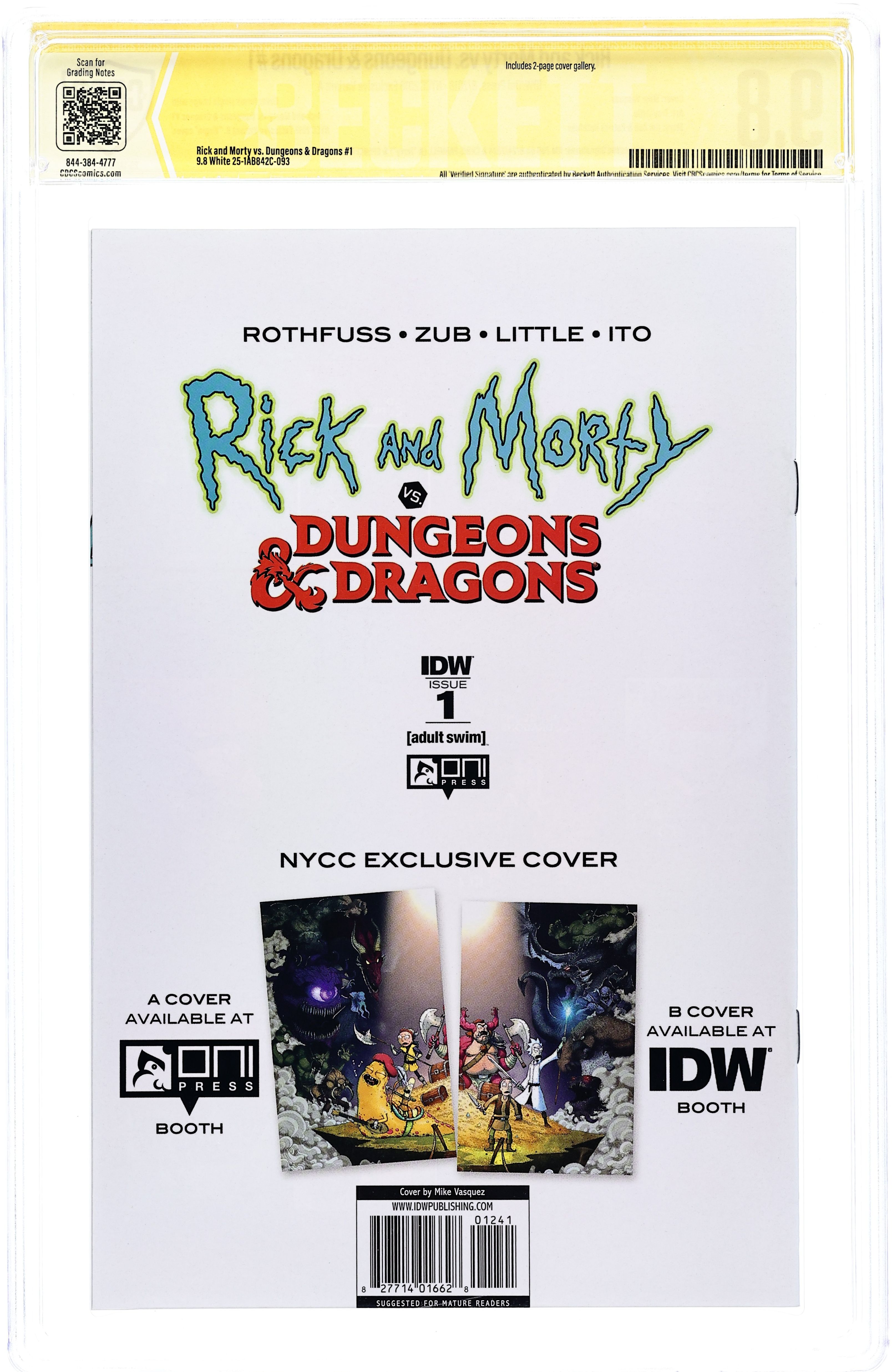 New York Comic Con 2018 Exclusive Connecting Virgin Variant "B" Cover by Mike Vasquez. Written by Patrick Rothfuss and Jim Zub. Art by Troy Little. When Morty needs to learn how to play D&D to keep up with the cool kids, his hard-drinking, old school-gaming, mad science-making grandpa is happy to teach him how to roll the dice, but neither of them is prepared for the saving throws they're about to fail or the true quest yet to come. Strap on a +1 longsword and grab your 10-foot pole, because this is going to be a gaming gauntlet like no other! The world's greatest role-playing game. Reality's most dysfunctional family. What could go wrong? 28 pages, full color. Mature Readers