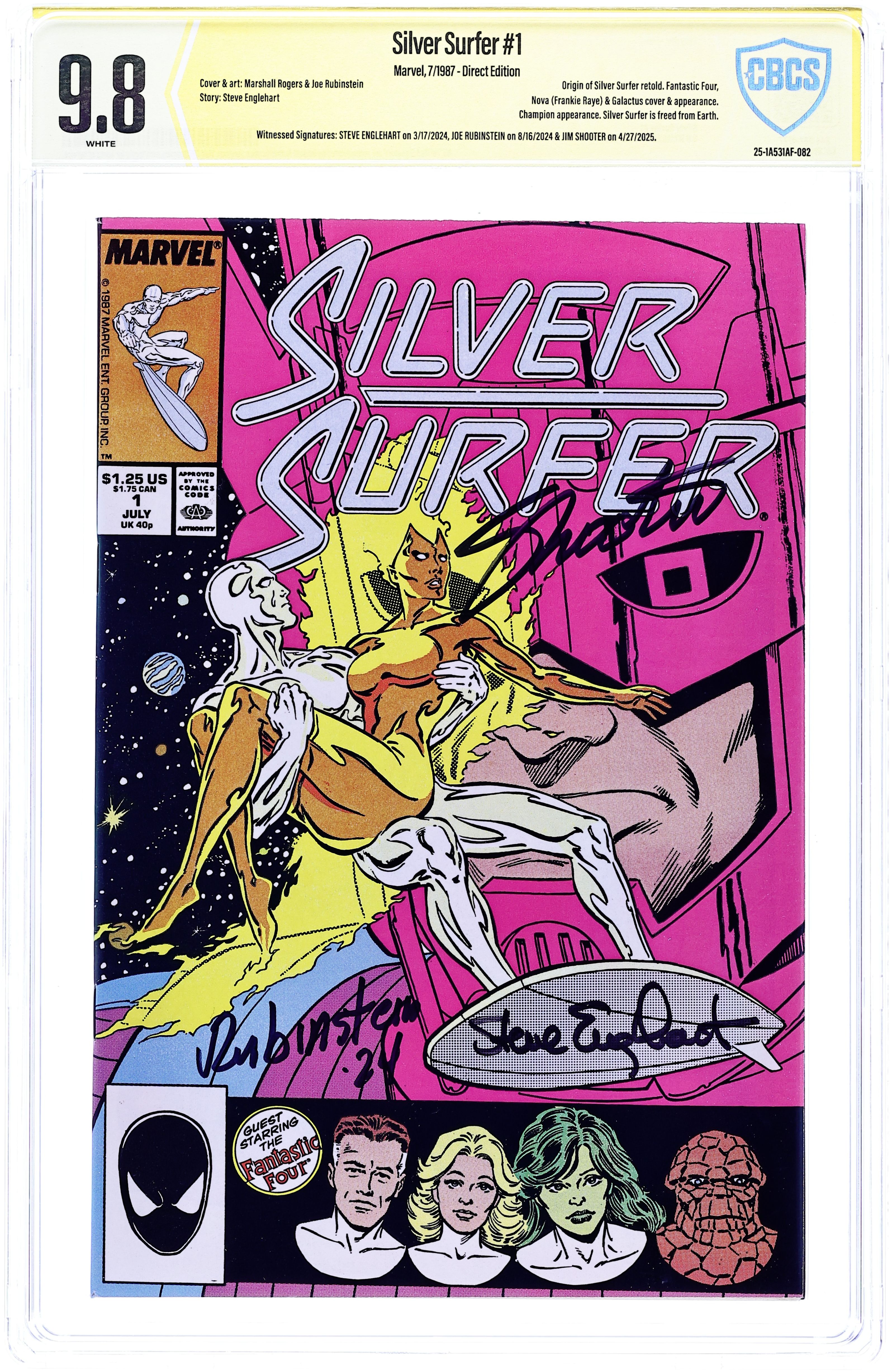 Direct Edition. "Free!" Guest-starring the Fantastic Four and Galactus. Story by Steve Englehart. Art by Marshall Rogers and Joe Rubinstein. Many years ago, in order to prevent the total annihilation of his civilization and homeworld, Norrin Radd bargained with the Devourer of Worlds. Imbued with the Power Cosmic, he became the Silver Surfer and Herald of Galactus. However, on the fateful day he arrived on Earth, for love of humanity, he betrayed his master, and thus was cursed to never traverse the spaceways again. Now, after many years of exile, will the Silver Surfer finally be free to soar the heavens again? Plus, witness the savage attack of Champion, an Elder of the Universe (last seen in Marvel Two in One (1974) Annual #7), as events are set in motion for the next 10 issues. 48 pages. Cover price $1.25.