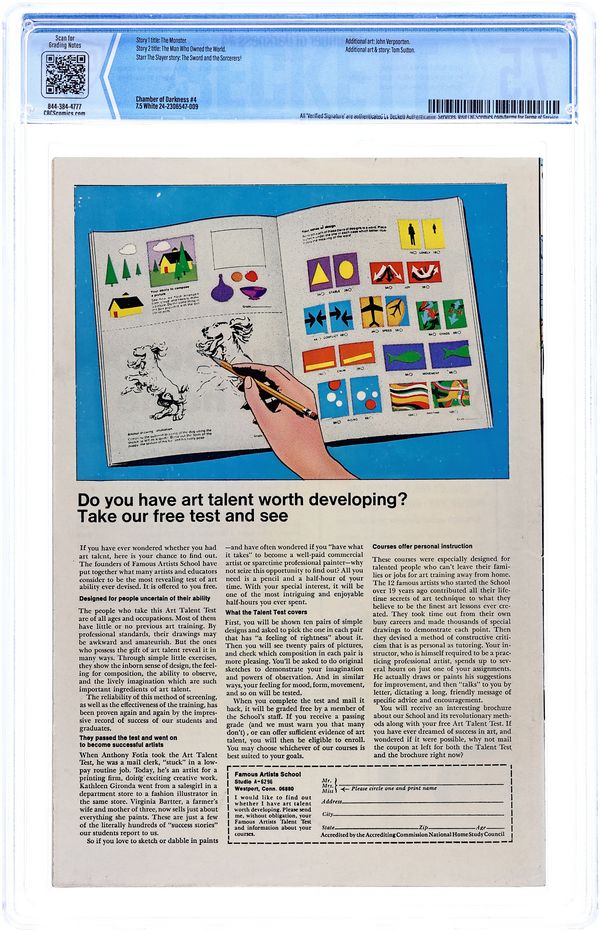 Cover pencils by Marie Severin (signed) [as 7EV], inks by Bill Everett (signed) [as 7EV]. The Monster, script and pencils by Jack Kirby, inks by John Verpoorten; A wealthy, ugly, and lonely man is believed to be a monster by the ignorant people of his village. The Man Who Owned the World, script by Denny O'Neil and Tom Sutton (plot), art by Tom Sutton; A greedy billionaire crashes the world economy to finance a scientist to send him into the future, where a horrible surprise awaits him. The Sword and the Sorcerers!, script by Roy Thomas, art by Barry Windsor-Smith [as Barry Smith]; Novelist Len Carson plans to write one final story in his popular sword and sorcery series to kill off the protagonist, Starr the Slayer, but his creation comes to life and kills him in self-defense; This is a Conan-esque story Windsor-Smith did to prepare for his work on Conan the Barbarian. Cover price $0.15.