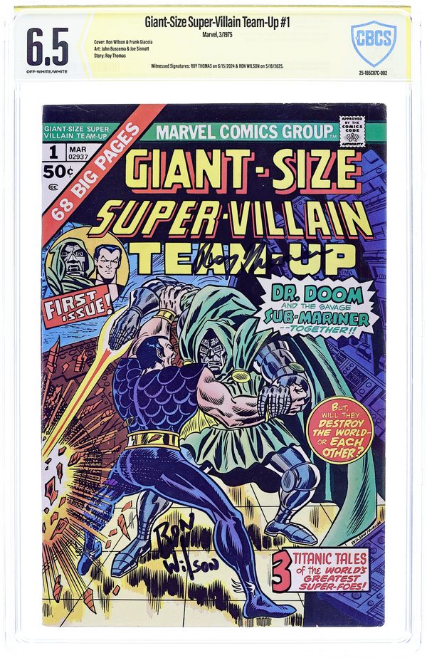 "Encounter at Land's End!" Script by Roy Thomas. Pencils by John Buscema. Inks by Joe Sinnott. Cover by Ron Wilson and Frank Giacoia. Following his defeat in Fantastic Four #144, Doctor Doom and the Sub-Mariner duke it out in the Atlantic Ocean. Flashback cameos by the Fantastic Four, Darkoth, Shalla Bal, and the Silver Surfer. First reprint story: "In the Darkness Dwells Doom!" Script by Roy Thomas. Pencils by John Buscema. Inks by Johnny Craig. While running from the police, the Sub-Mariner seeks shelter in the Latverian Embassy. Of course he meets Doctor Doom...who else? Story originally published in Sub-Mariner #20. Second reprint story: "This Man – This Demon!" Story by Larry Lieber and Roy Thomas. Pencils by Larry Leiber and Frank Giacoia. Inks by Vince Colletta. Dr. Doom enters into an uneasy alliance with Diablo in order to see Valeria again. Story originally published in Marvel Super-Heroes (1st series) 20. (Notes: The two reprint stories are intertwined with the feature story in this issue. Doctor Doom appears next in Fantastic Four #155. The two-issue Giant-Size Super-Villain Team-Up series preceded the Super Villain Team-Up series. The first issue of the regular SVTU series was published in August 1975. This issue includes a one-page essay from Roy Thomas explaining the plans for Super-Villain Team-Up.) 64 pages Cover price $0.50.