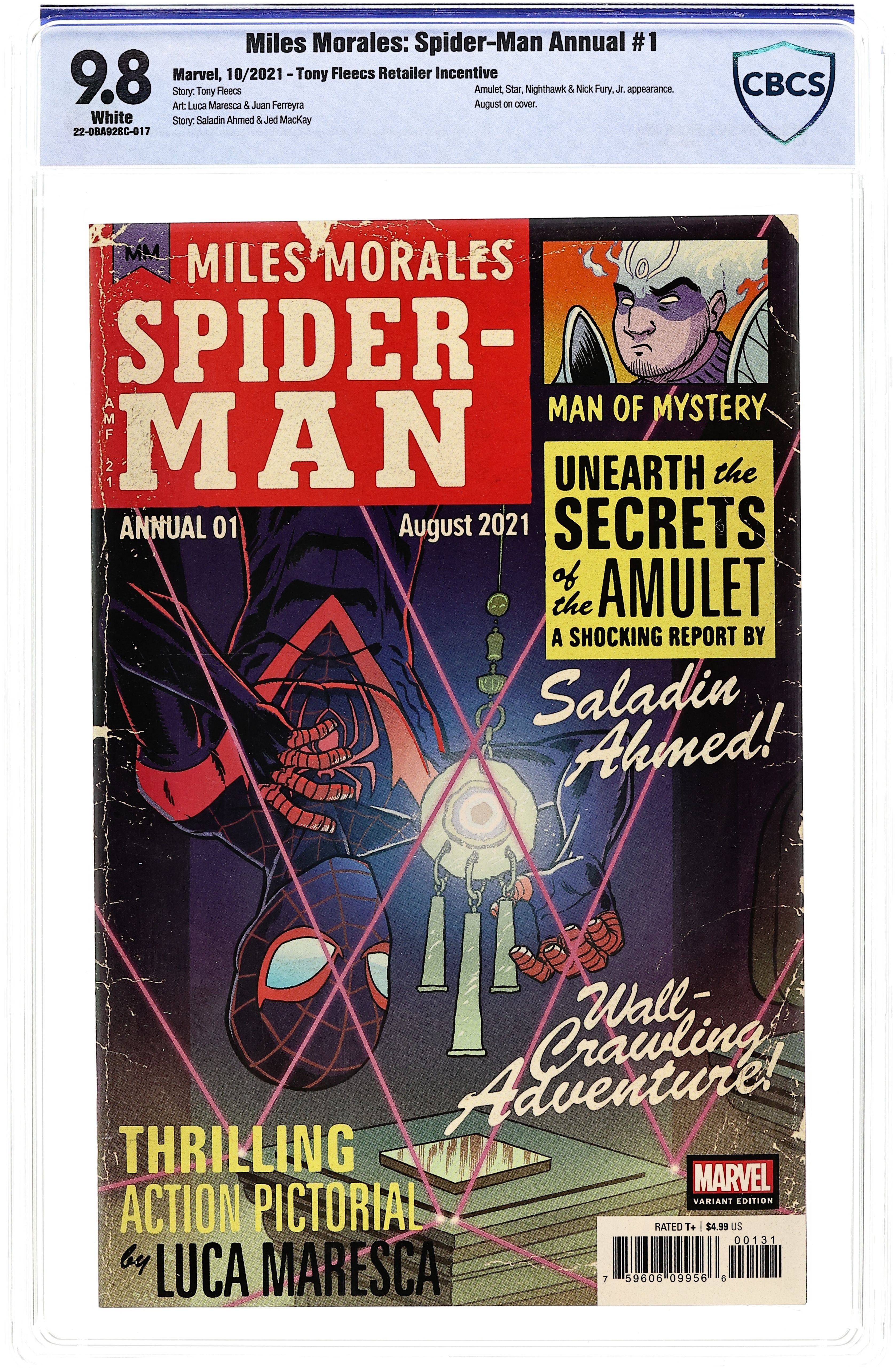Limited 1 for 25 Retailer Incentive Variant Cover. Written by Saladin Ahmed, Jed MacKay. Art by Luca Maresca, Juan Ferreyra. Cover by Tony Fleecs. FIGHT AT THE MUSEUM! Miles Morales is investigating a series of monster attacks in Brooklyn when he runs into Ms. Marvel's friend and ally AMULET! Together they connect the monsters to a series of cursed magical objects. But who activated them, and why? And can Spider-Man and Amulet find out before the monsters take them down too? ALSO IN THIS ISSUE: Part 6 (of 8) of 'Infinite Fury'! 36 pages, full color. Rated T+ Cover price $4.99.