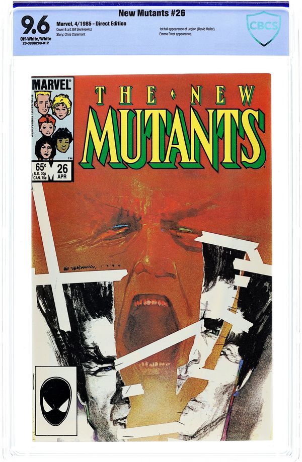 Direct Edition. First 65-cent cover price issue. 1st full appearance of Legion. Cover art by Bill Sienkiewicz. Legion, script by Chris Claremont, art by Bill Sienkiewicz; Gabrielle Haller's autistic son begins exhibiting telepathic, telekinetic, and pyrotic powers; Prof. X and the New Mutants come to help; Wolfsbane encounters Rev. Craig again; Emma Frost gives Empath an ultimatum; Magneto and Aleytys begin a relationship. 36 pgs. $0.65. Cover price $0.65.