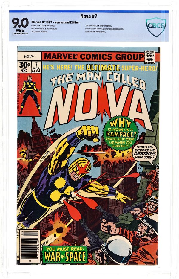Written by Marv Wolfman. Pencils by John Buscema. Inks Joe Sinnott. When a dying alien passes on his super-powers to Earth teenager Richard Rider, Rider becomes the man called Nova, the human rocket! In the marvelous tradition of Spider-man, Nova must now stop the murderous alien known as Zorr, or Earth is doomed! Note: First appearance of Nova. 36 pages, full color. Cover price $0.30.