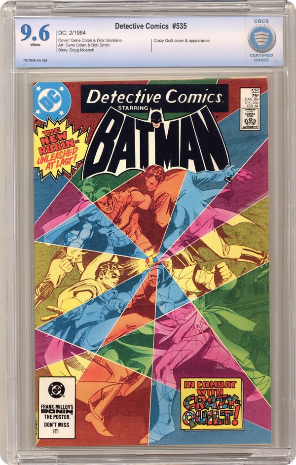 Direct Edition. 1st Jason Todd in Robin costume. "One Hole in a Quilt of Madness!" Story by Doug Moench. Art by Gene Colan and Bob Smith. It's Jason Todd's first adventure as Robin the Boy Wonder and he has been seriously injured in battle with the Crazy-Quilt. However, the criminal underworld will soon learn there is more to this new Robin than meets the eye. Plus, Green Arrow's solo adventure continues in "On the Cheap...The Black Box III!" Part 3 of 4. Story by Joey Cavalieri. Art by Shawn McManus. 36 pgs. Cover price $0.75.