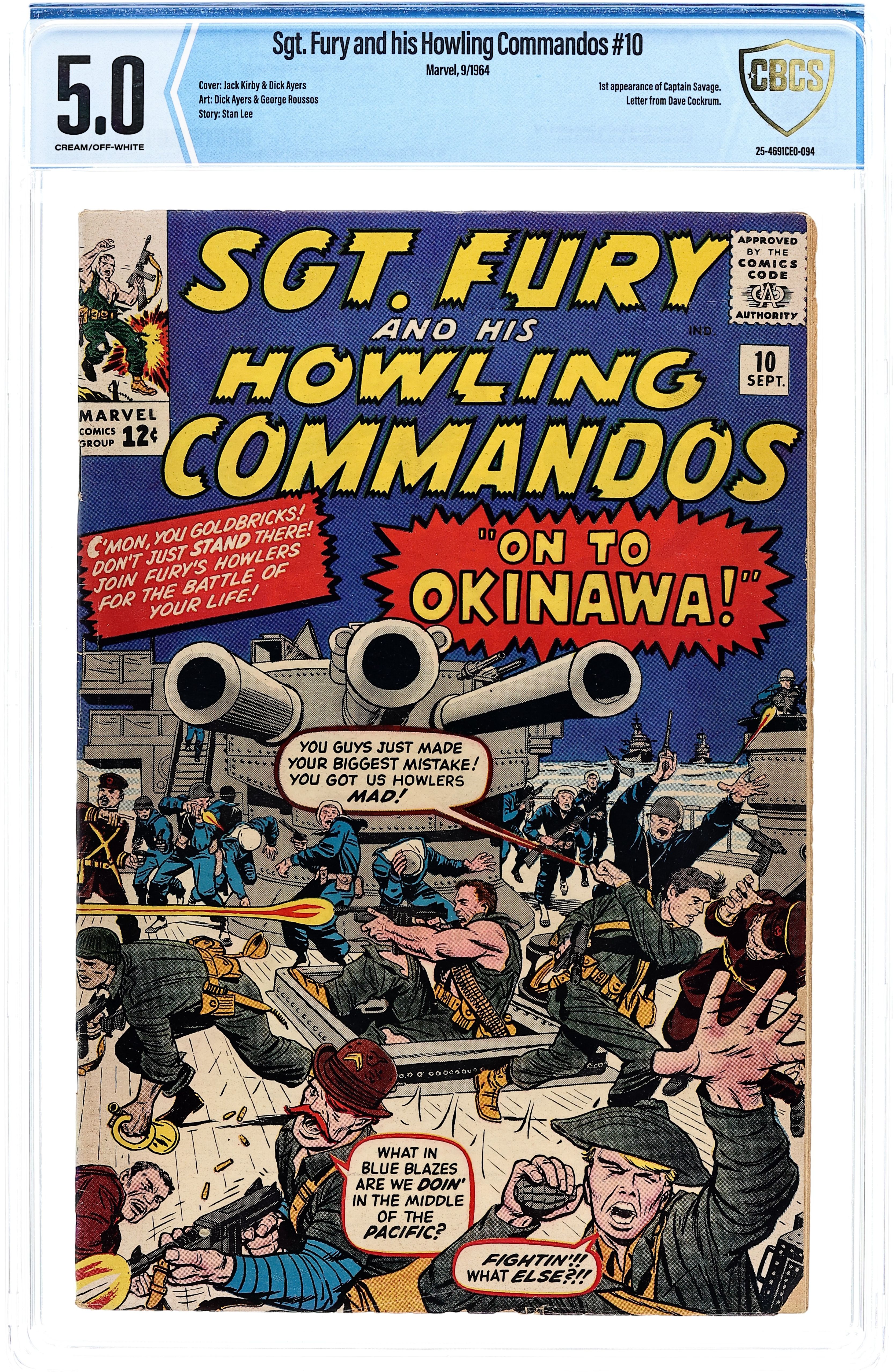 Starts May 11 "On To Okinawa!" Written by Stan Lee. Pencils by Dick Ayers. Inks by George Roussos [as Geo. Bell]. Cover pencils by Jack Kirby with inks by Dick Ayers. The Howling Commandos are sent to Okinawa to rescue Colonel Parker from a Japanese prison. Notes: First appearance of Captain Savage (as the Skipper). Letter to the editor from comics artist Dave Cockrum. Cover price $0.12.