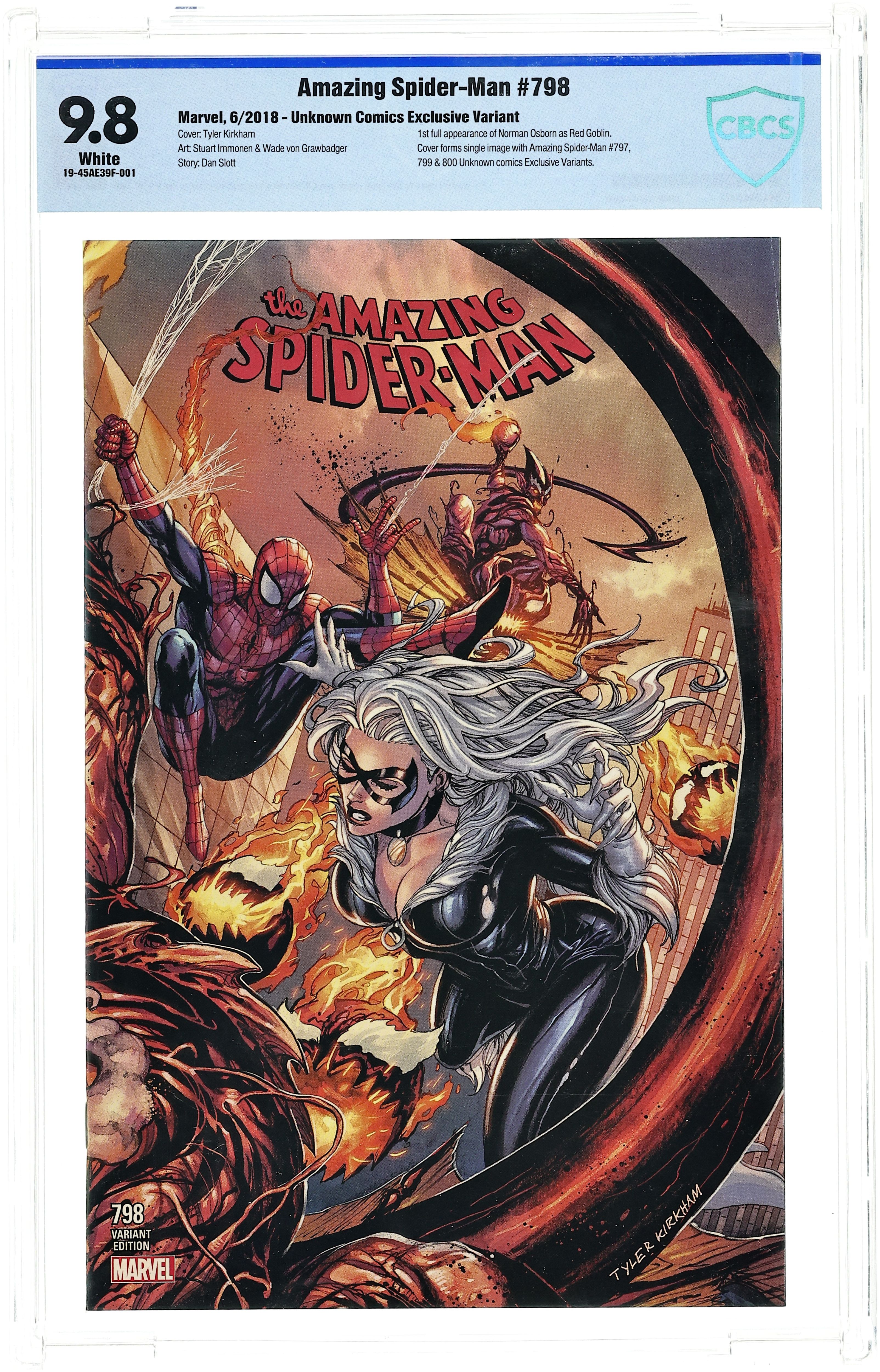 Unknown Comics exclusive variant by Tyler Kirkham. The Osborn Identity: Part 1 of 4 - Written by Christos Gage, Daniel Slott, Jacob Chabot, James Asmus, Cale Atkinson and Hannah Blumenreich. Art by Guiseppe Camuncoli, Johanna Tana Ford, Ray-Anthony Height, and Todd Nauck, Stuart Immonen, Hannah Blumenreich, and Cale Atkinson. HUGE BLOWOUT ISSUE! STUART IMMONEN (STAR WARS, AVENGERS) takes the artist reins of AMAZING SPIDER-MAN and joins Dan Slott for a 40-page main story! Then don't miss a super-secret short story by Dan and Giuseppe Camuncoli! TOP-SECRET BONUS CREATIVE TEAM!!! Hannah Blumenreich makes hers Marvel, making her Spider-Debut! Cale Atkinson brings another story of the A-May-ZING SPIDER-AUNT! 92 pages, full color. Rated T