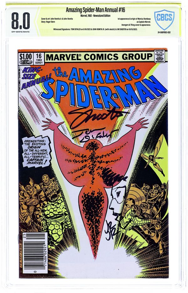 - Witnessed Signatures: Tom Defalco on 6/18/2023, John Romita Jr (with sketch) and Jim Shooter on 10/15/2023. Newsstand Edition.
