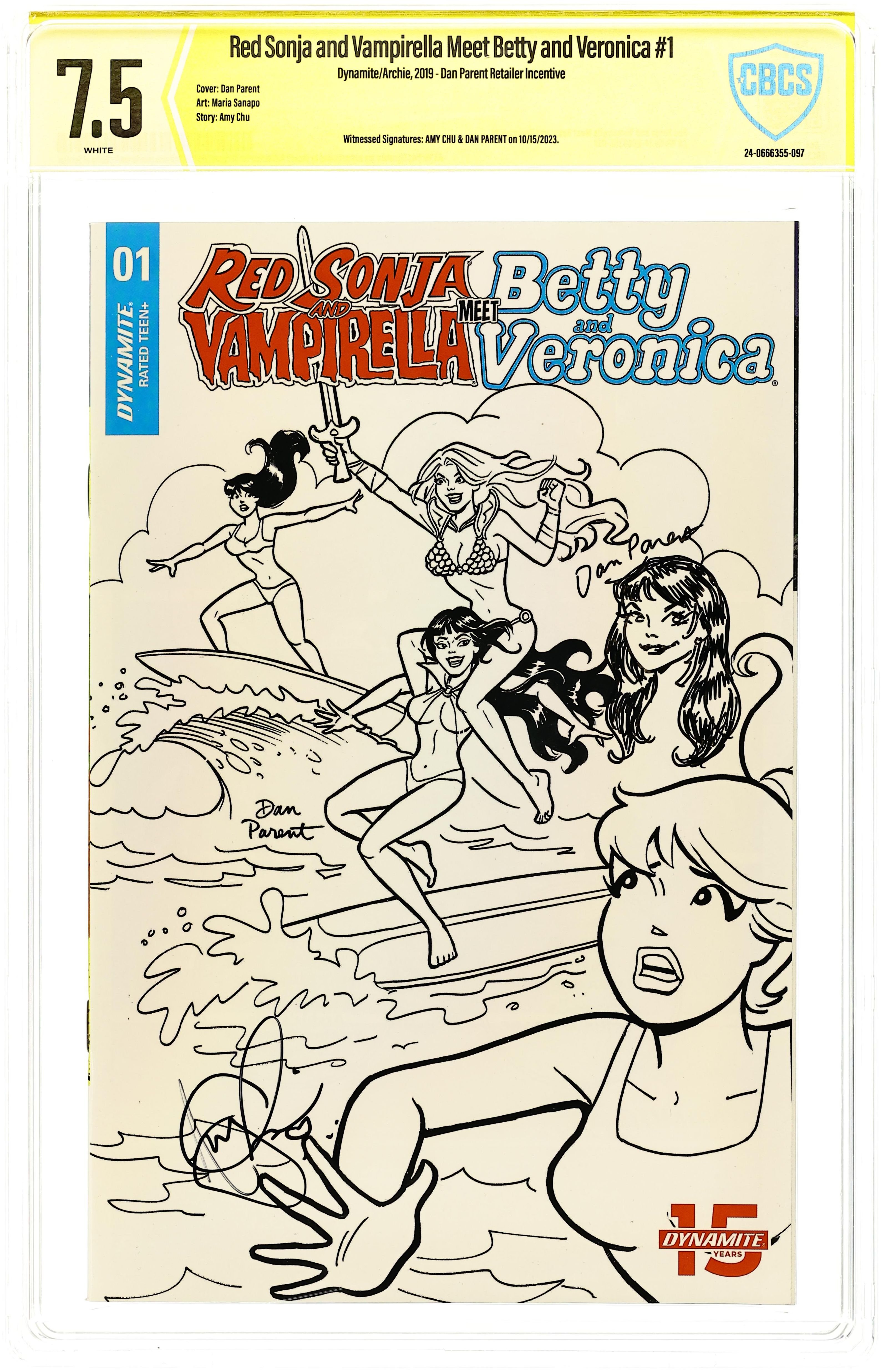 Limited 1 for 10 Retailer Incentive Variant Cover. Written by Amy Chu. Art by Maria Sanapo. Cover by Dan Parent. Mystery, murder, and mayhem descends on Riverdale as four of your favorite comic book women meet for the first time. A string of paranormal, unsolved murders leads the vampire hunter Vampirella and her sword-wielding barbarian partner Red Sonja to the small, sleepy town where things always seem to happen… There they discover Betty and Veronica, investigative reporters for the high school newspaper, also hot on the trail of the same killer. 32 pages, full color. Rated T+ Cover price $3.99.