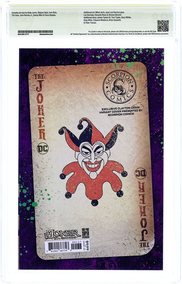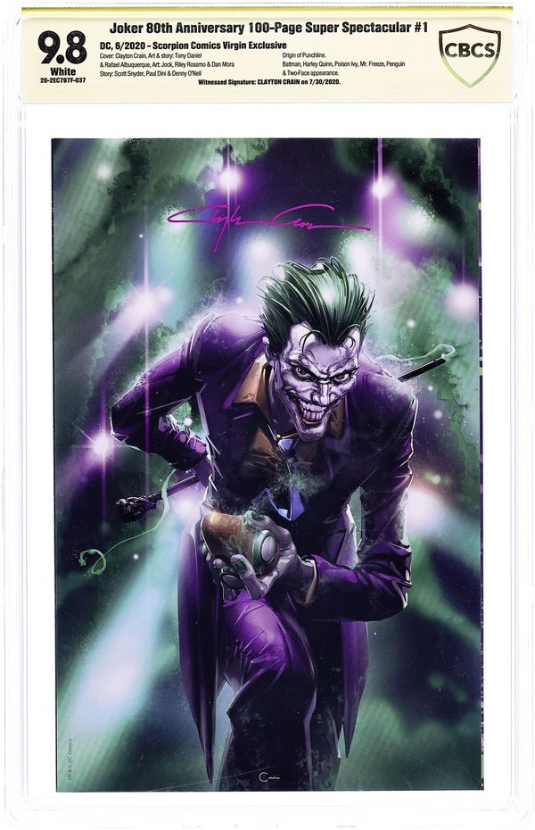 Scorpion Comics Exclusive Virgin Cover by Clayton Crain. Written by Scott Snyder, James Tynion IV, Gary Whitta, Greg Miller, Denny O'Neil, Peter J. Tomasi, Paul Dini, Tom Taylor, Eduardo Medeiros, Rafael Albuquerque, Tony S. Daniel and Brian Azzarello. Art by Jock, Mikel Janin, Dan Mora, José Luis García-López, Joe Prado, Simone Bianchi, Riley Rossmo, Eduardo Risso, Rafael Albuquerque, Tony S. Daniel and Lee Bermejo. The Clown Prince of Crime celebrates 80 years of chaos! The Joker has been the greatest villain in comics since his debut and to celebrate we have a who's who of comics' finest talent giving the Harlequin of Hate the birthday roast he deserves. The stories feature a range of terror and anarchy, showing how the Joker has impacted Gotham City from the police to Arkham Asylum, from the local underworld to the Dark Knight and his allies! Make sure to RSVP to this birthday bash -- you wouldn't want to wake up with a Joker Fish on your doorstep, would you? Featuring: "Scars" by Scott Snyder and Jock; "What Comes After a Joke?" by James Tynion IV and Mikel Janin; "Kill the Batman" by Gary Whitta, Greg Miller and Dan Mora; "Introducing the Dove Corps" by Denny O'Neil, José Luis García-López and Joe Prado; "The War Within" by Peter J. Tomasi and Simone Bianchi; "The Last Smile" by Paul Dini and Riley Rossmo; "Birthday Bugs" by Tom Taylor and Eduardo Risso; "No Heroes" by Eduardo Medeiros and Rafael Albuquerque; "Penance" by Tony S. Daniel; and "Two Fell Into the Hornet's Nest" by Brian Azzarello and Lee Bermejo. Plus pin-ups by Kelley Jones, Stjepan Šejić, Ivan Reis, Tim Sale, John Romita, Jr. and Danny Miki, and Fiona Staples. 96 pages, full color. Rated T+. NOTE: Generic image is of a signed copy, this does not necessarily reflect all copies.