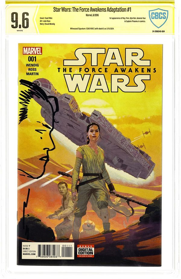Written by Chuck Wendig. Art by Luke Ross. Cover by Esad Ribic. It's true-all of it! The biggest movie of the year jumps from the big screen to the comic book page! It's been three decades since the Rebel Alliance destroyed the Death Star and toppled the Galactic Empire...but now, on the remote planet of Jakku...there is a stirring in the Force. A young scavenger named Rey...a deserting stormtrooper named Finn...an ace pilot named Poe...and a dark apprentice named Kylo Ren...Their lives are about to collide as the awakening begins. 44 pages, full color. Rated T Cover price $4.99.