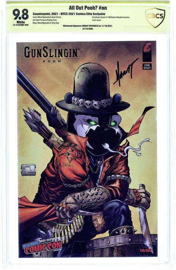 Comics Elite New York Comic Con Exclusive "Gunslingin' Pooh" Edition Variant Cover by Marat Mychaels - Limited to 500 copies. Story by Marat Mychaels and Terry Sala. Art by Sean Forney. 24 pages, full color. NOTE: Generic image is of a signed copy, this does not necessarily reflect all copies.