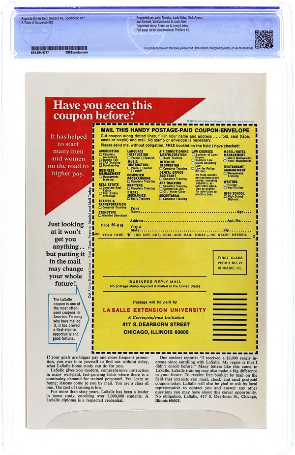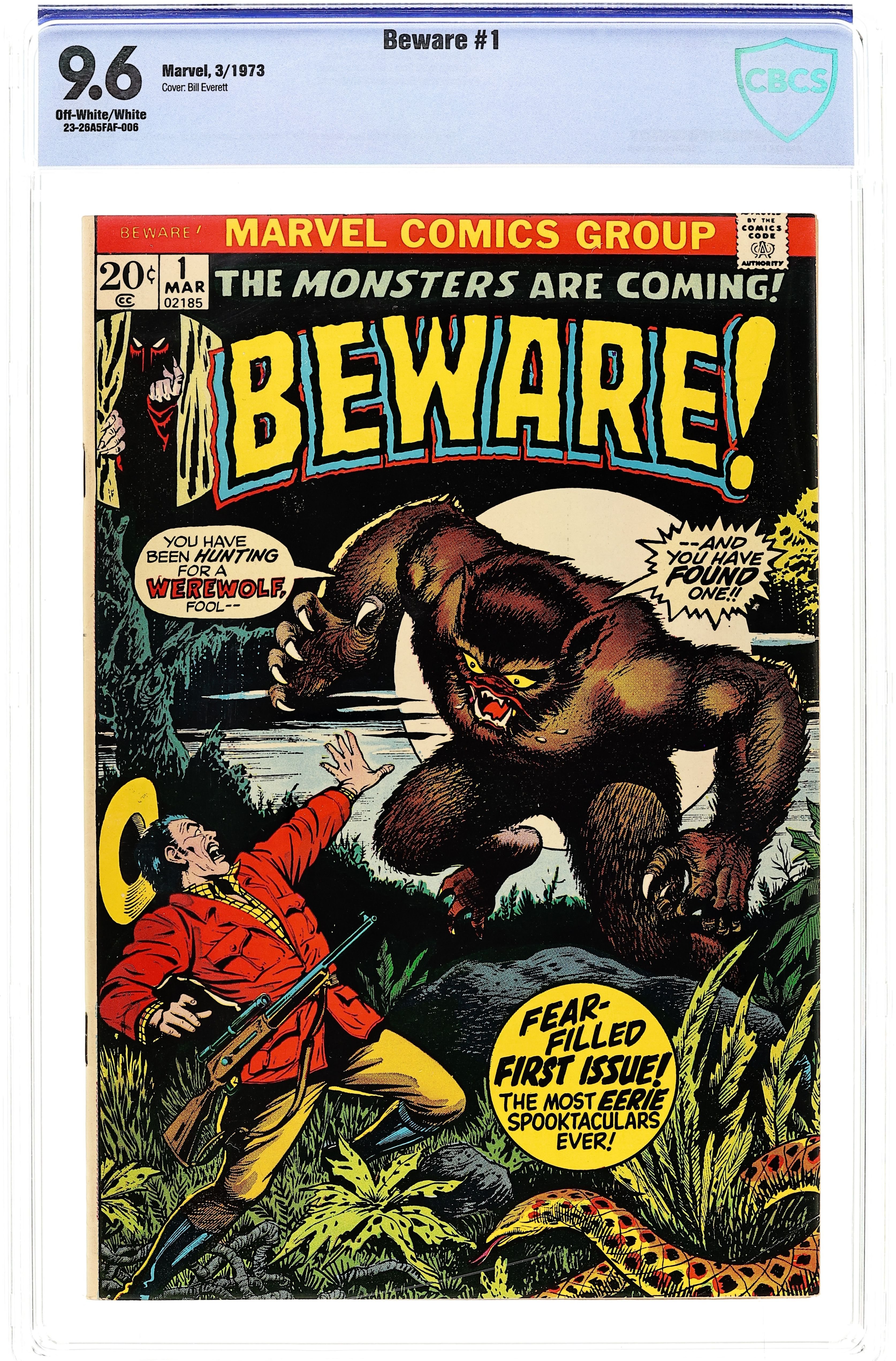 "The Werewolf Was Afraid!"; "Too Human to Live!" with art by Carabotta/Abel; "On the Trail of the Witch!" with pencils by Jack Kirby; and "Behind the Door" with art by Joe Sinnott. Cover by Bill Everett. Stories by John Romita, Vic Carabotta, Jack Abel, Stan Lee, Larry Lieber, Jack Kirby, Dick Ayers, and Joe Sinnott. Beware of these fear-filled suspense stories fill with action, intrigue and, best of all, monsters! All reprints from Menace, Spellbound, and Tales of Suspense. 36 pages, full color. $0.20. Cover price $0.20.