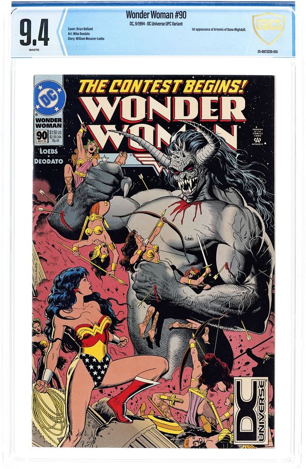 DC Universe variant. The Contest: Part 1 of 5: Homeward Gazings - Written by William Messner-Loebs. Art by Mike Deodato. Cover by Brian Bolland. It's catch-up time, as the Amazons recount their battle against a demon invasion, and Diana defends her recent drastic actions to her mother -- prompting the Queen to call for another Contest! First appearance of Artemis. Continued in Wonder Woman (1987-2006 2nd Series) #0. 36 pages, full color. Cover price $1.50.