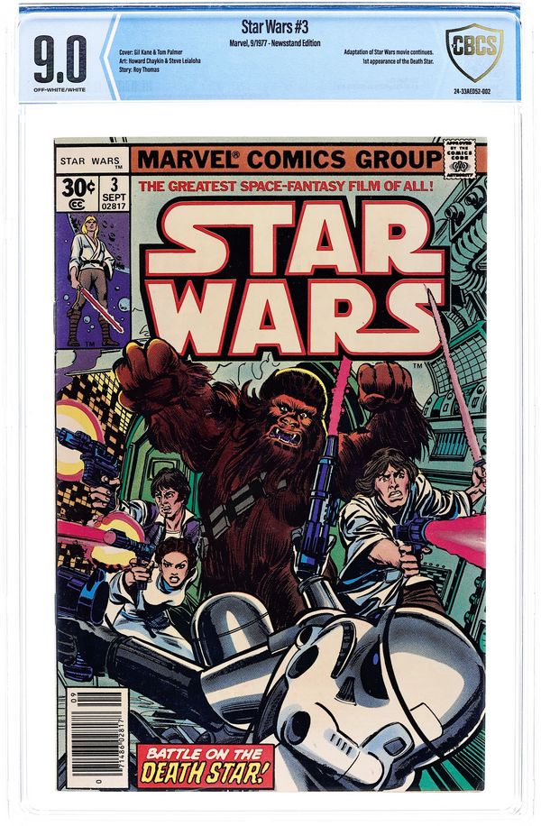 1st printing, standard 30 Cent Newsstand Edition with UPC. A New Hope: Part 3 of 6. "Death Star!" Based on the screenplay by George Lucas. Adapted by Roy Thomas. Art by Howard Chaykin and Steve Leialoha. The evil Galactic Empire tests its ultimate weapon on Princess Leia's homeworld with devastating results. Meanwhile, Ben Kenobi begins Luke Skywalker's training in the ways of the force. However things take a turn for the worse when the Millennium Falcon is captured within the unrelenting grasp of the Death Star's tractor-beam. Now, it's up to this small motley band of heroes to mount a daring rescue attempt of the Princess from within the very bowels of the Empire's most powerful weapon. Cover price $0.30.