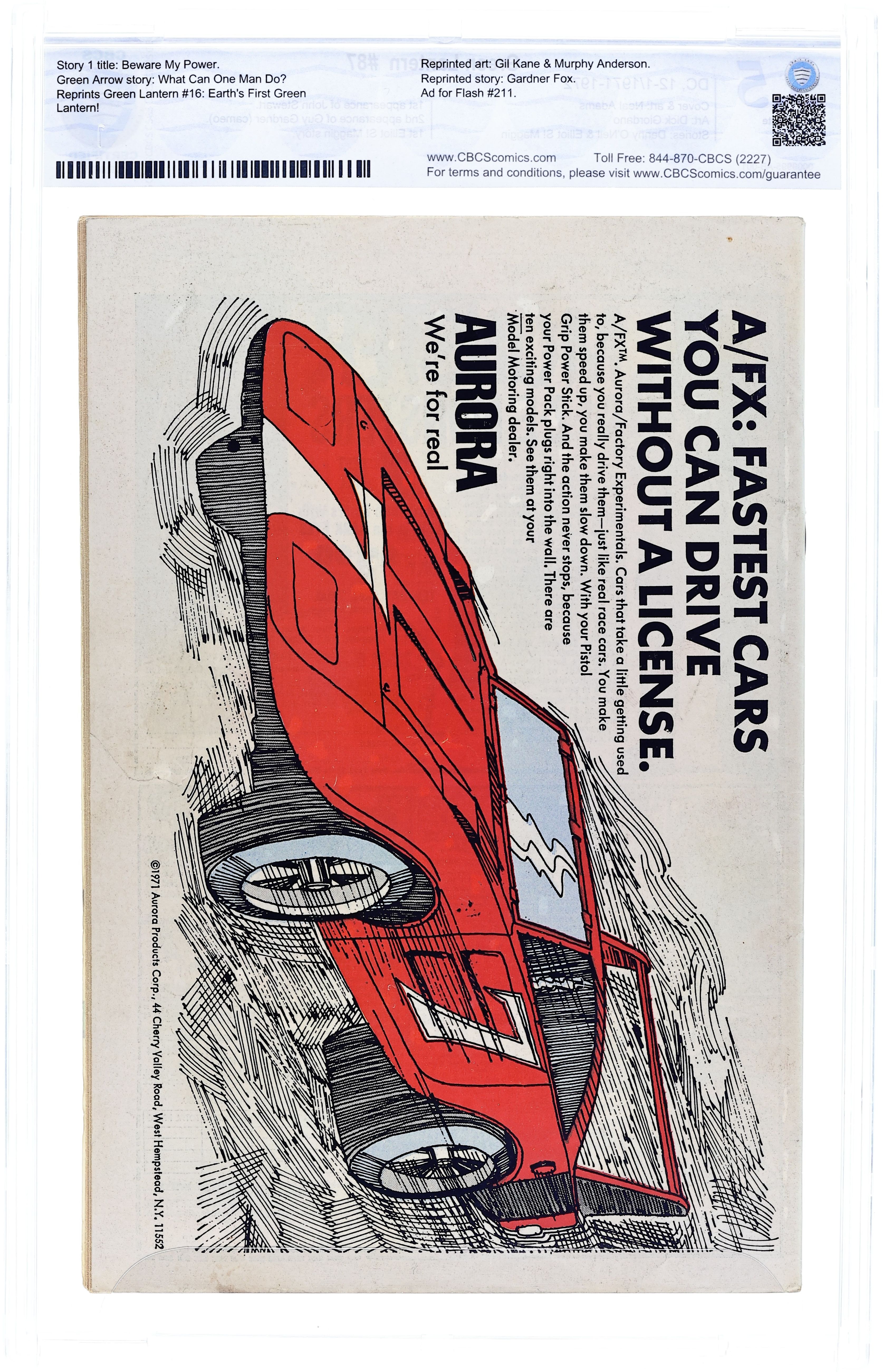 Giant-size issue. Cover by Neal Adams. First appearance of John Stewart in Beware My Power, script by Denny O'Neil, pencils by Neal Adams, inks by Dick Giordano; When Guy Gardner is injured, the Guardians of the Universe instruct Hal Jordan to train another back-up, but John Stewart has different ideas about how to be a Lantern; When an attempt is seemingly made on the life of racist politician Jeremiah Clutcher, John Stewart figures out that the attack was faked and part of a cynical plot to get Clutcher elected president. What Can One Man Do?, script by Elliot Maggin, pencils by Neal Adams, inks by Dick Giordano; After Green Arrow witnesses the death of a young boy in a riot, he decides that he might be able to do more for his city as its mayor. Reprint back-up story: Earth's First Green Lantern!, (from Green Lantern 16), script by Gardner Fox, pencils by Gil Kane, inks by Murphy Anderson; Hal Jordan explains to Pieface why Abin Sur came to Earth in a spaceship when all Green Lanterns can travel thru space unaided. The Flash ad. 52 pgs., full color. $0.25. Cover price $0.25.