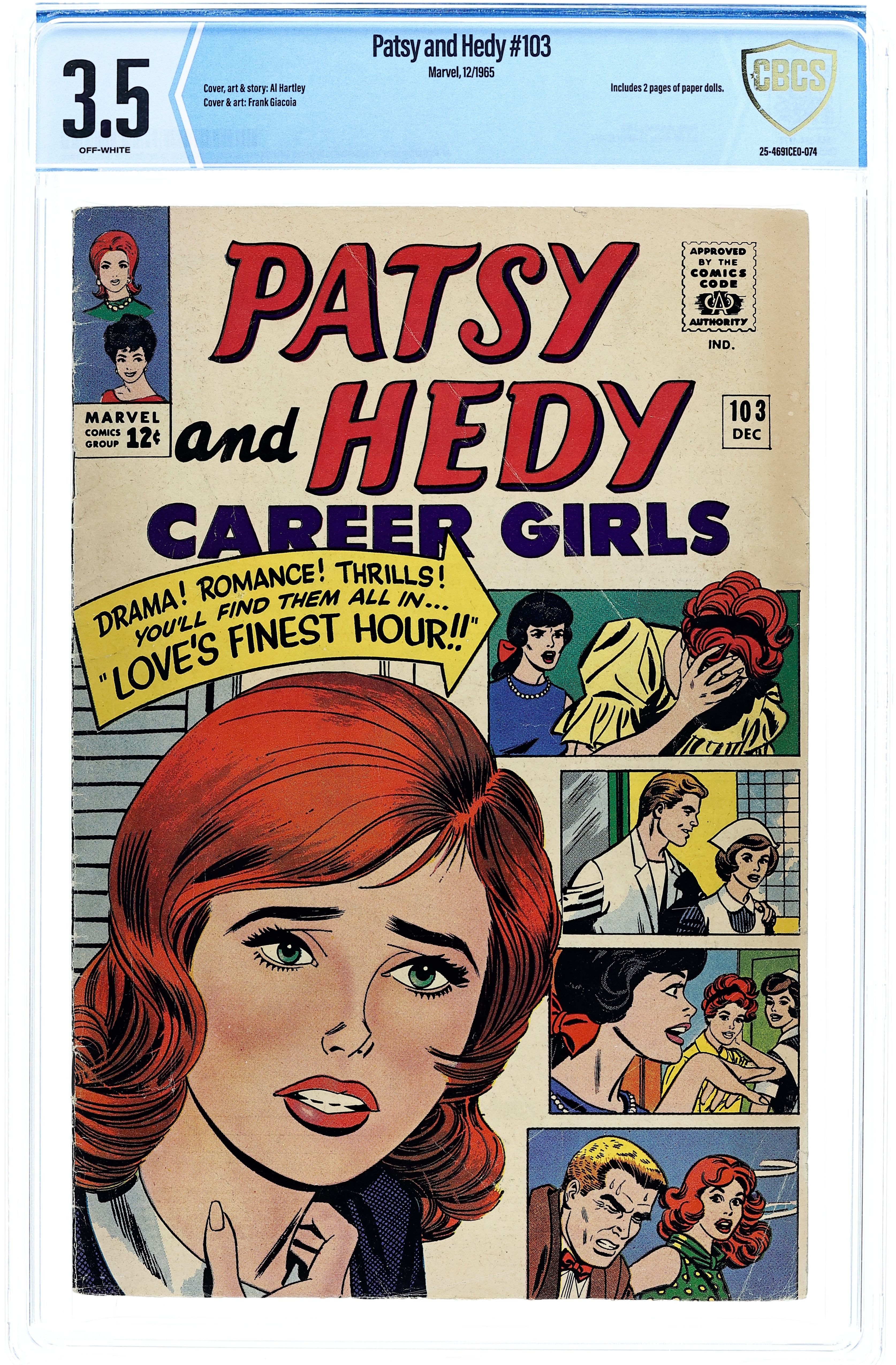 Starts May 11 Cover inks by Frank Giacoia. Love's Finest Hour!, script and pencils by Al Hartley, inks by Frank Giacoia. fashion page. Patsy's Fashion Page. Hedy's Favorite Fashions. Hedy's Marvelous Hairstyles fashion page. More Mike Herald Fashions. Paper dolls. 36 pgs. $0.12. Cover price $0.12.